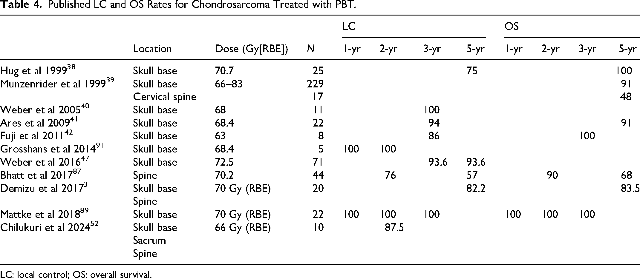 Published LC and OS Rates for Chordoma Treated with PBT.