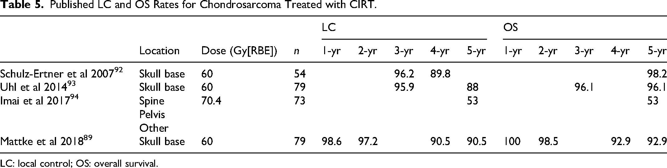 Published LC and OS Rates for Chondrosarcoma Treated with CIRT.