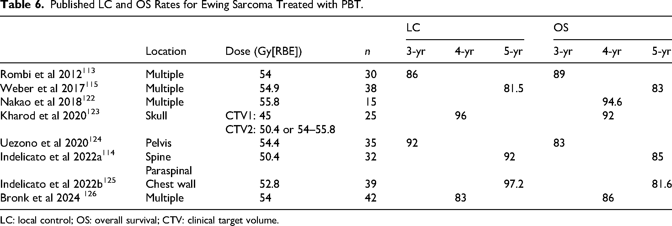 An overview of the published LC and OS rates for PBT in Ewing sarcoma can be found in Table 6. The benefits of aggressive treatment of metastatic Ewing sarcoma with local therapy have been consistently supported by multiple studies,116–118 and, in cases of pulmonary metastases, whole-lung irradiation (WLI) remains the standard of care.119–121 However, SBRT has emerged as a promising alternative for consolidating metastatic sites and achieving durable tumor control. 10