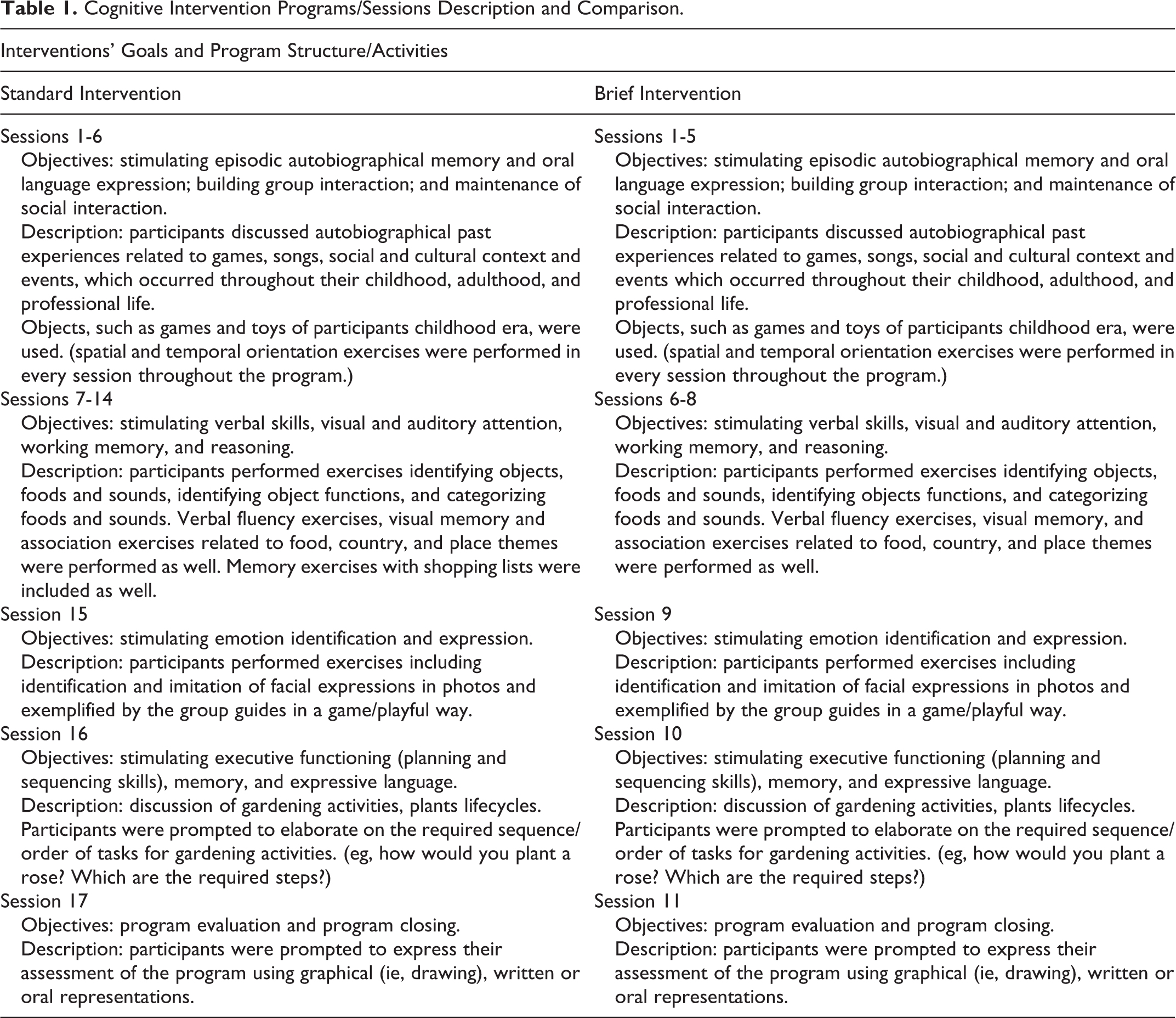 Cognitive Intervention Programs/Sessions Description and Comparison.