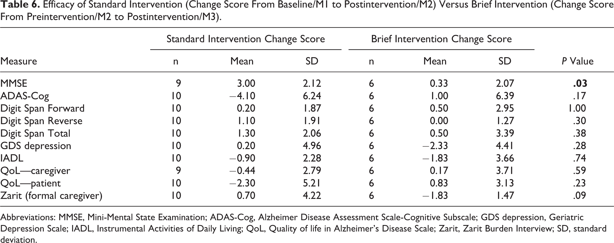 The comparison of the 2 intervention groups’ change scores (Table 6) showed statistical significant differences in MMSE (Z = −2.20,