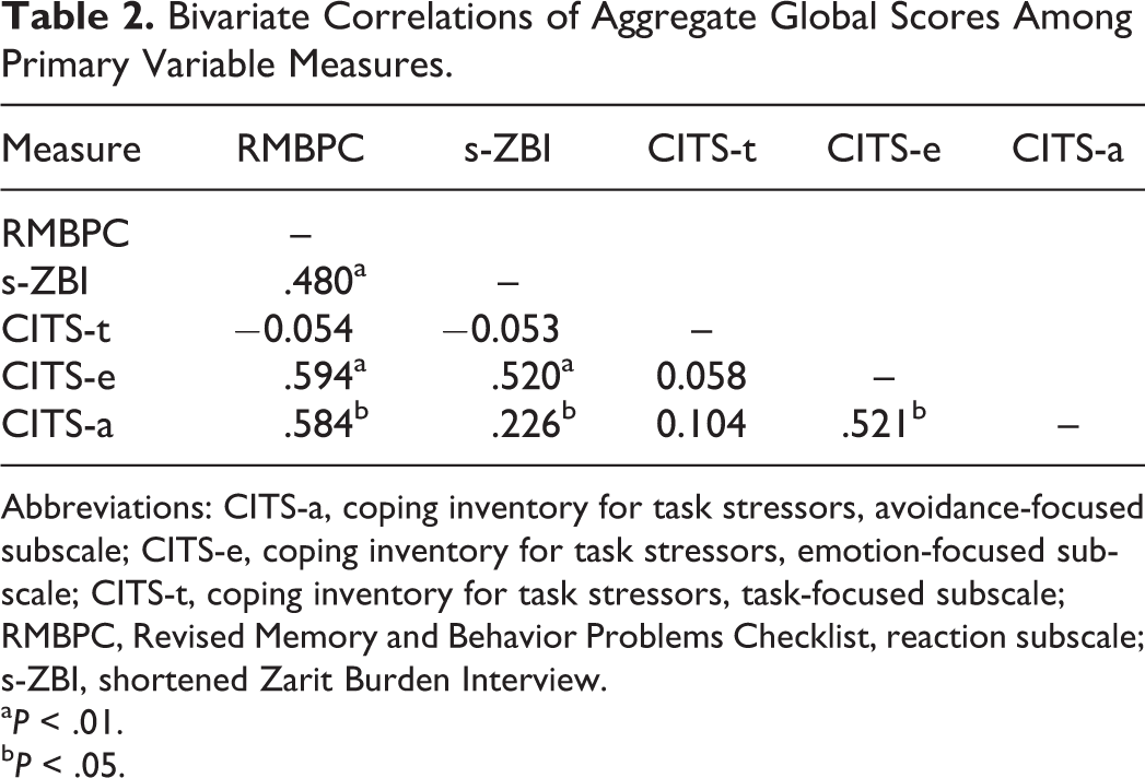 The strength of association between the burden measures, shortened ZBI and RMBPC, was fairly strong and significant. Task-focused coping correlated negatively, although not significantly, with each burden measure. Emotion-focused coping associated positively and moderately strong with each burden measure. Avoidance-focused coping correlated in a similar manner with the burden measures. These latter 2 coping strategies significantly correlated with each other, although neither significantly associated with task-focused coping. Please refer to Table 2 for statistical, correlational details of these primary variables.
