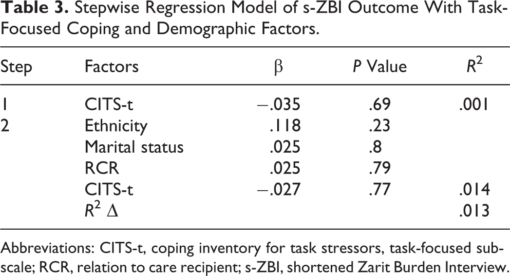 Stepwise Regression Model of s-ZBI Outcome With Task-Focused Coping and Demographic Factors.