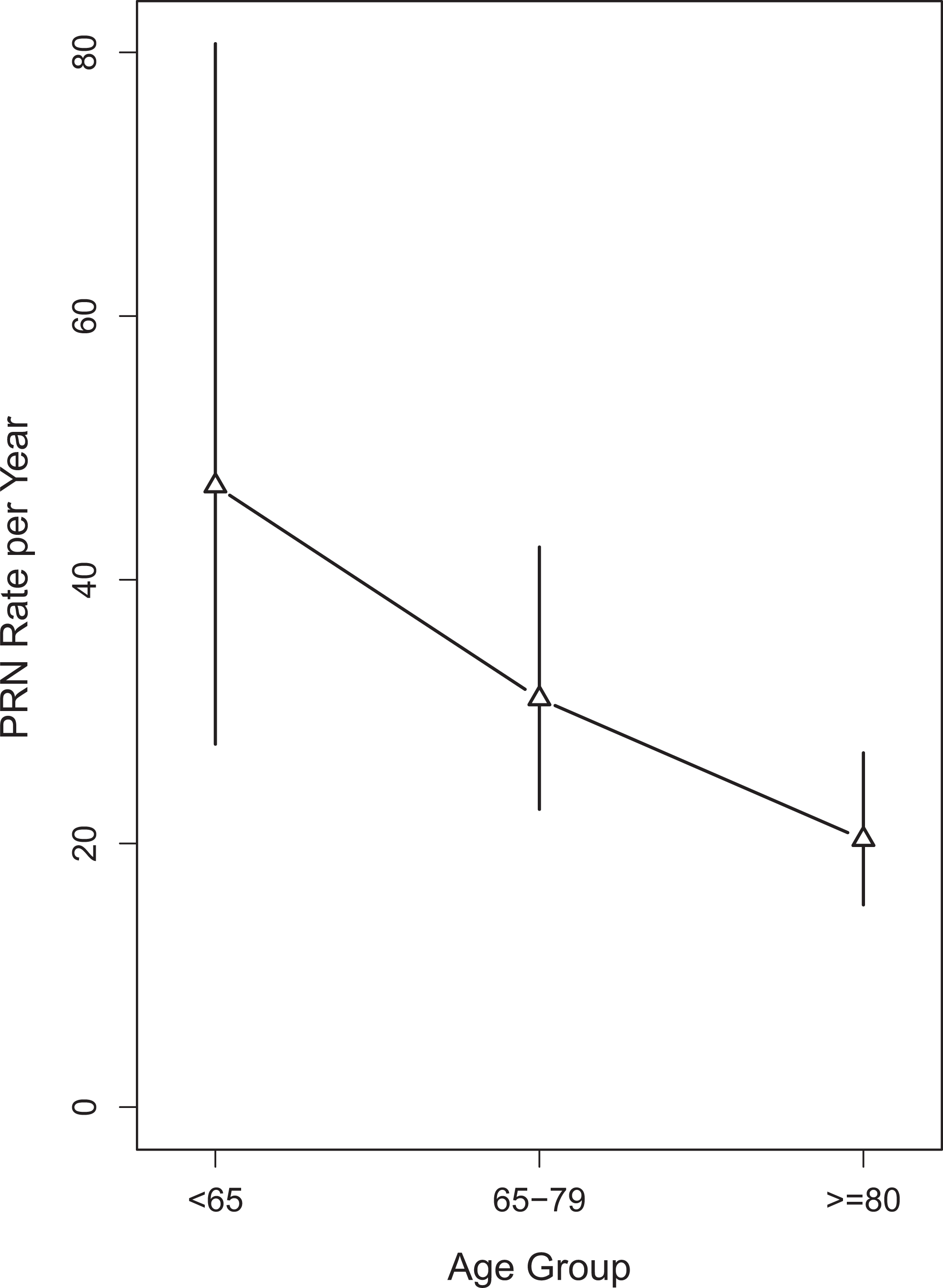 Rate of PRN administration based on age with 95% CI. Rates of administration are calculated as the number of PRN doses per year of observation within each group. PRN indicates pro re nata; CI, confidence interval.