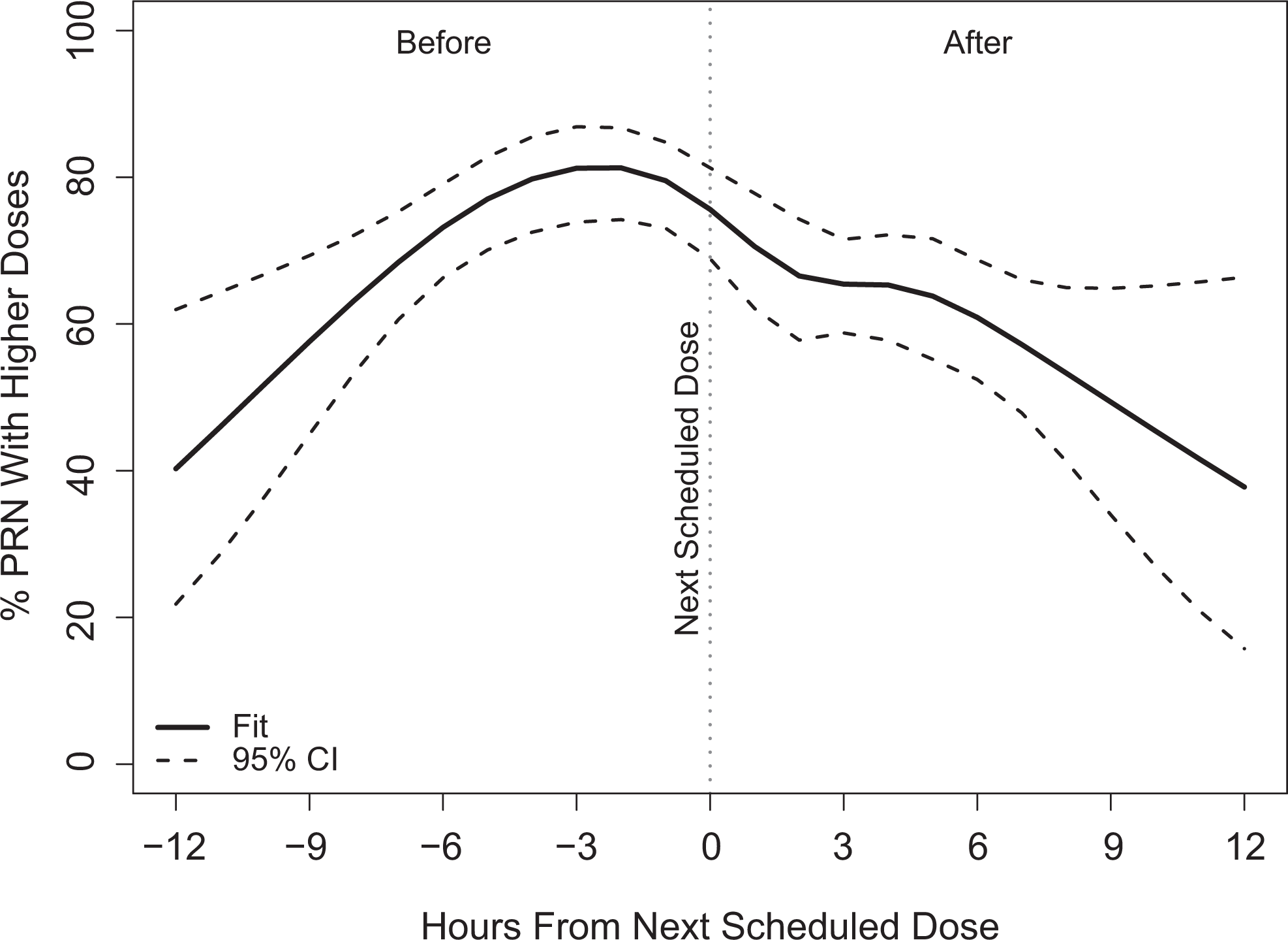 When further analyzing those PRN orders that were written as a range in relation to the next scheduled dose, we identified a peak approximately 3 hours before the next scheduled dose when nearly 80% of PRNs administered were at the higher dose (Figure 6).