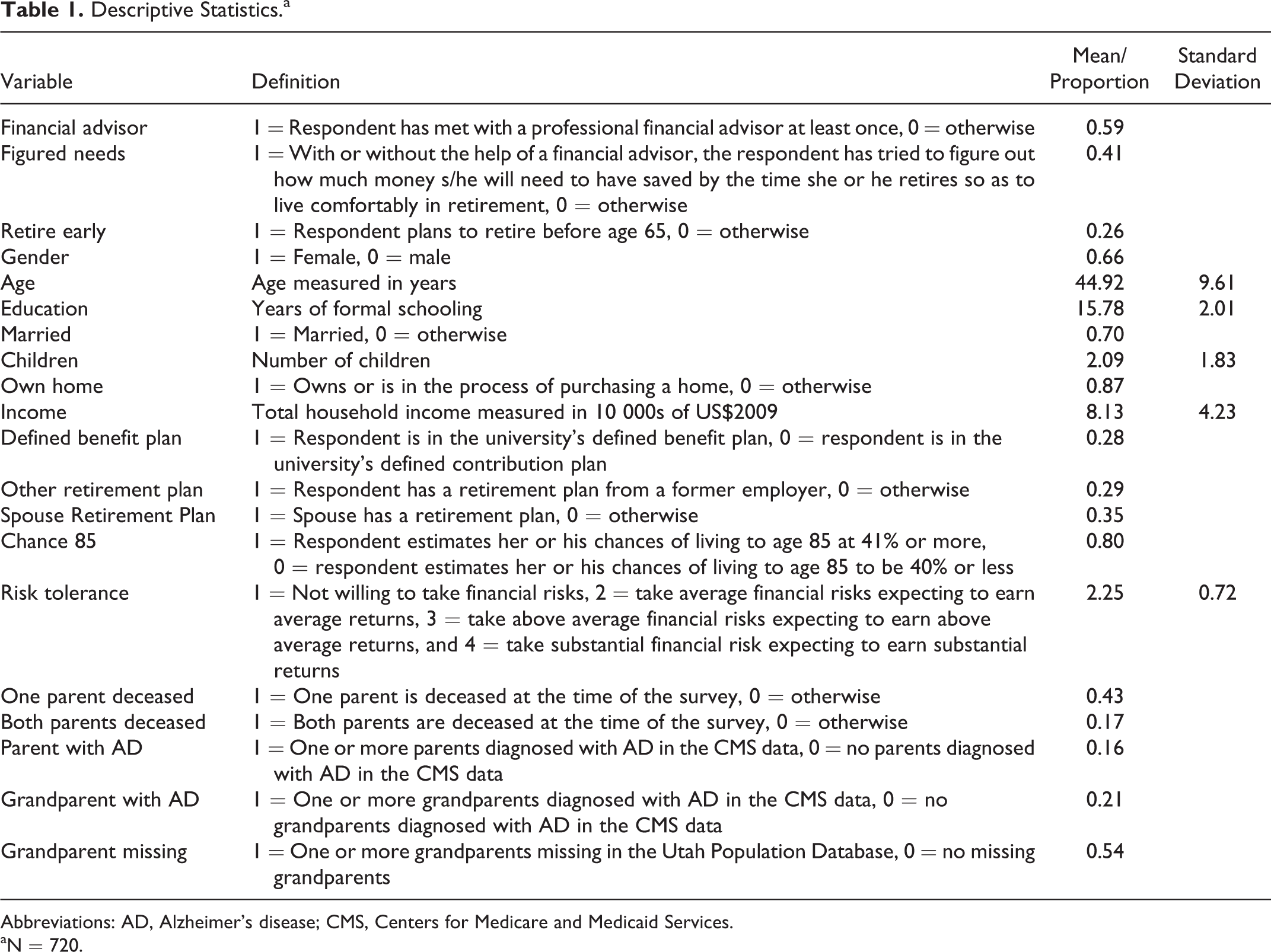 Unique, high-quality data from 3 sources are linked to test our hypotheses. Information on retirement planning comes from the University of Utah’s Retirement Planning Survey (UURPS). The UURPS was designed to assess University of Utah employees’ retirement planning knowledge, priorities, perceptions, and behaviors. All University of Utah benefits-eligible employees with valid e-mail addresses (N = 9747) were invited to participate online in the UURPS during October 2009, and 3000 people submitted completed surveys (32.1% cooperation rate). This survey focused on retirement planning and thus, questions regarding family health histories and perceived risk of someday receiving an AD diagnosis were not included.
