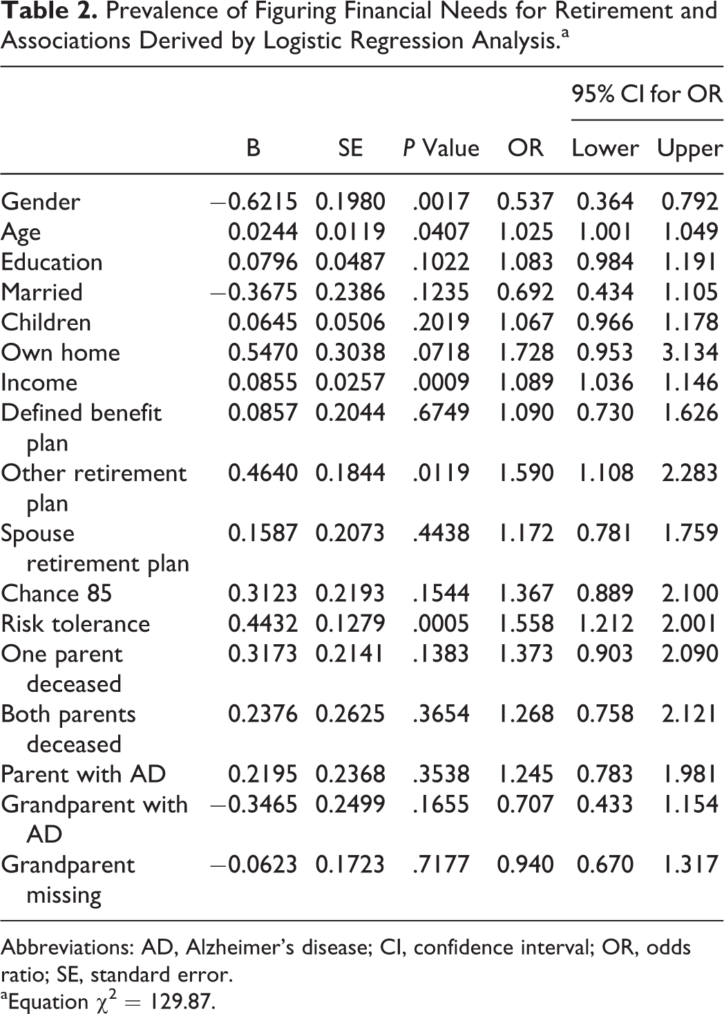Prevalence of Figuring Financial Needs for Retirement and Associations Derived by Logistic Regression Analysis.a