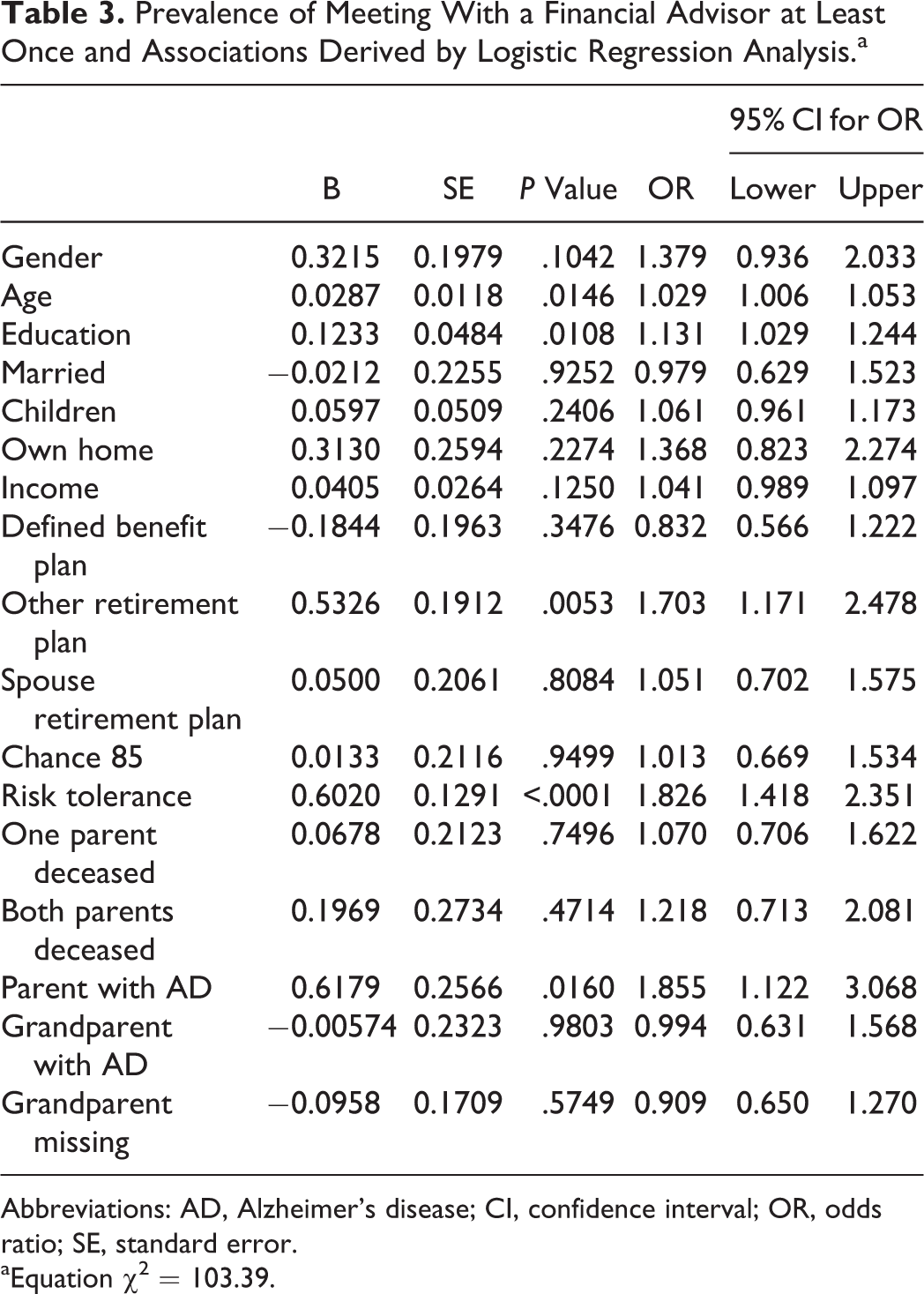 Prevalence of Meeting With a Financial Advisor at Least Once and Associations Derived by Logistic Regression Analysis.a