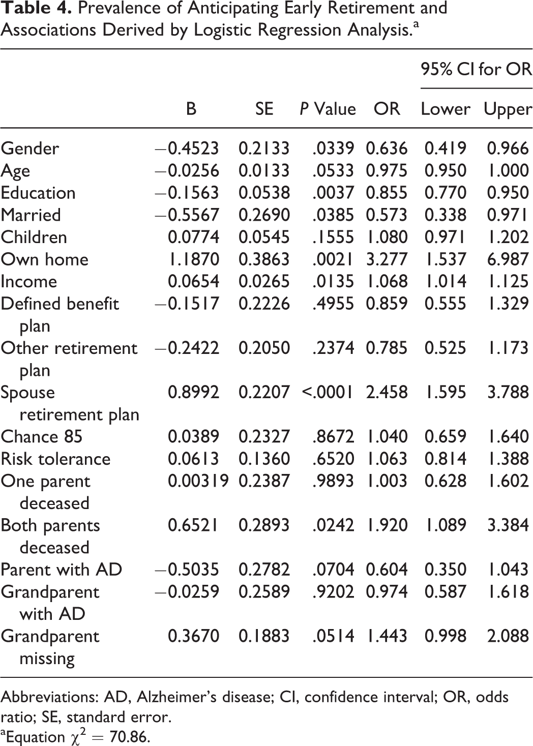 Prevalence of Anticipating Early Retirement and Associations Derived by Logistic Regression Analysis.a