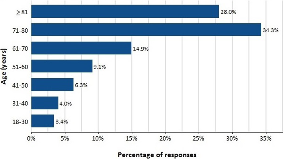 The vast majority (84.2%) reported that at least 1 patient/wk required CO on their unit and 24.4% indicated at least 2 COs per week. Once used, most (59.9%) continued CO for “over a few days” (Table 2). The most frequent conditions that necessitated the use of CO (sometimes/often/very often) were dementia with agitation (90.2%), suicidal ideation (82.3%), and delirium (78.8%). Over three-quarters (77.2%) reported that patients most frequently requiring CO were older than 60 years and 62.3% reported most frequent CO use in patients older than 70 years (Figure 1).