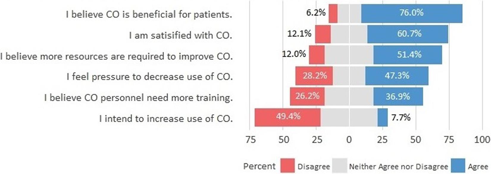 While 76.0% of participants indicated that CO was beneficial for patient care, 84.1% reported that they have tried to decrease the use of CO, with almost half (47.3%) reporting that they “felt pressured” to decrease the use of CO. Only 28.2% disagreed with the statement “I feel pressure to decrease use of CO.” A small minority (7.7%) intended to increase the use of CO (Table 2 and Figure 2).