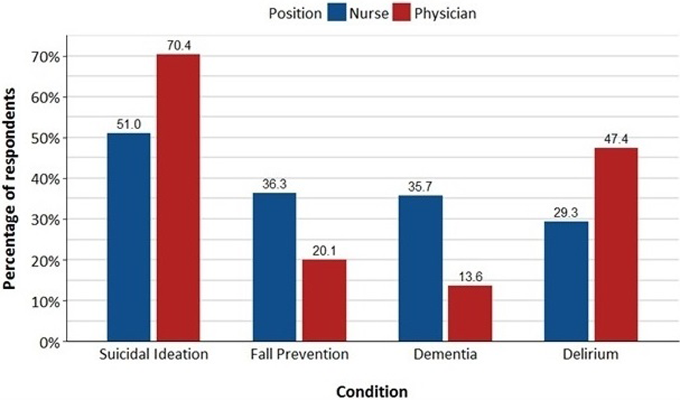 The frequent use of CO has major staffing and cost implications for the health-care industry, yet CO practices for older adults with cognitive impairment have been poorly described in the acute care setting. 20, 21 The present study aimed to elucidate physician and nursing practices and perceptions regarding the use of CO for older adults with cognitive impairment in the acute care setting.