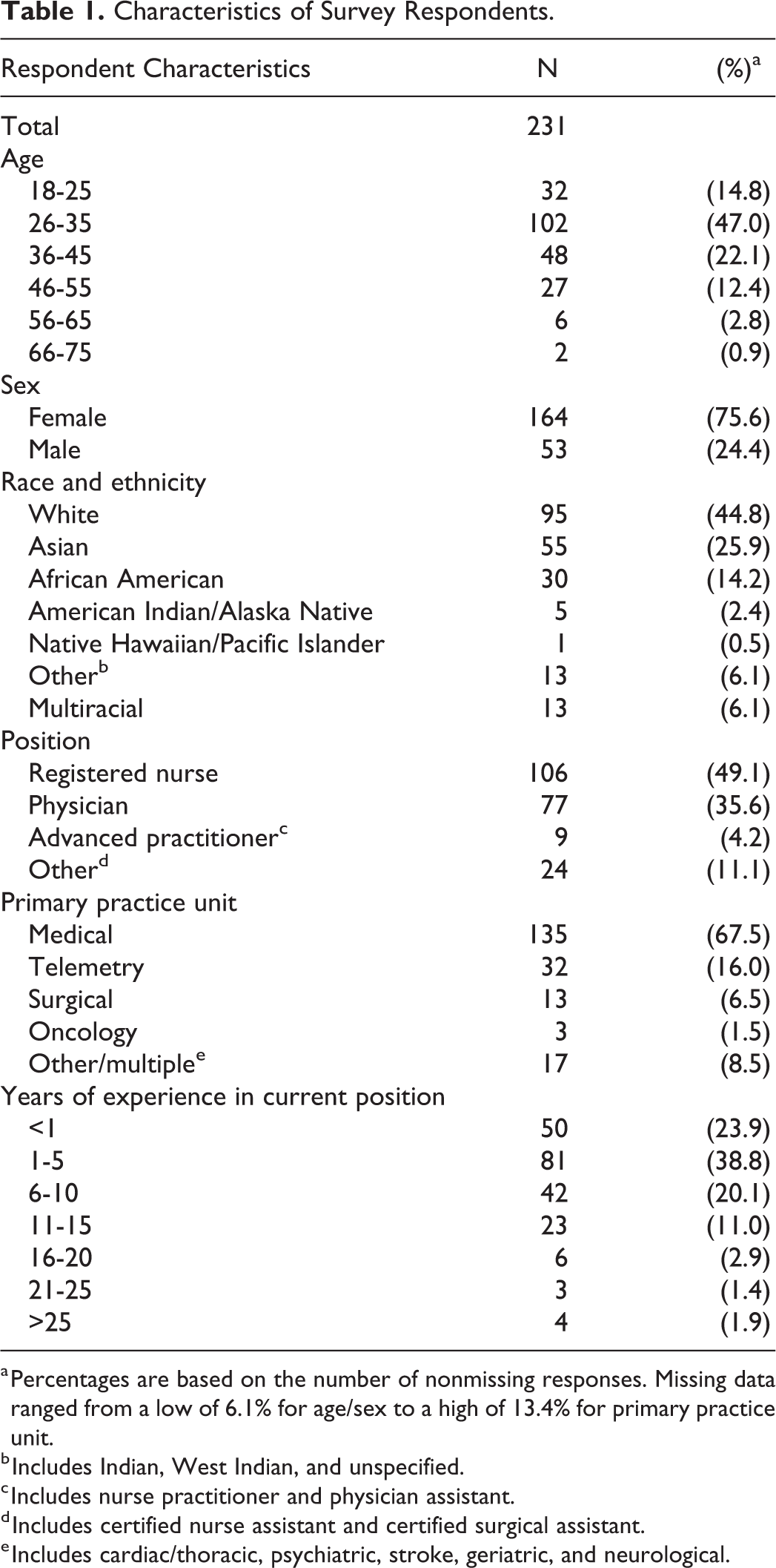 a Percentages are based on the number of nonmissing responses. Missing data ranged from a low of 6.1% for age/sex to a high of 13.4% for primary practice unit.