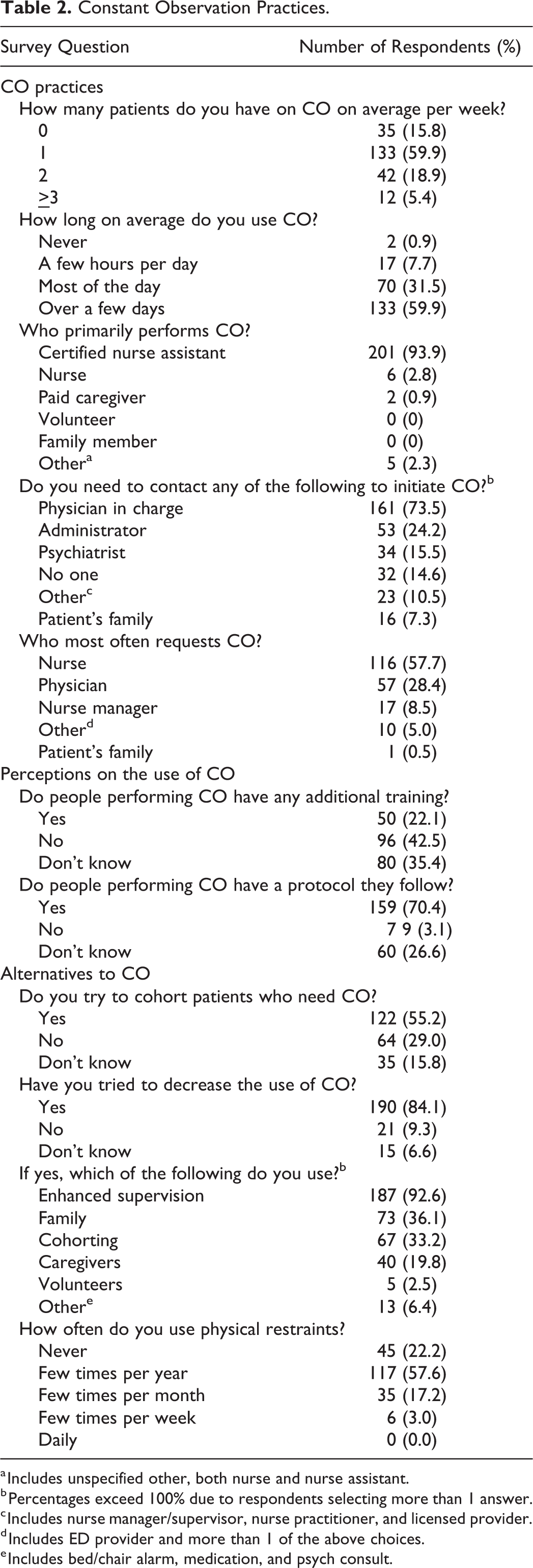 With regard to approaches to decrease the use of CO, almost all (92.6%) used enhanced supervision, followed by family/caregiver (55.9%) and cohorting (33.2%), while only 2.5% reported the use of volunteers. Other approaches included the use of medications and psychiatric consultation. Furthermore, the majority (77.8%) reported using physical restraints at least a few times a year and 20.2% indicated using restraints at least a few times per month or more (Table 2).