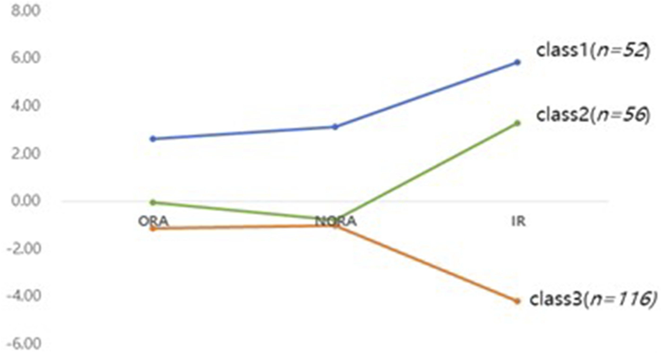 Figures 1 and 2 provides a visual representation of the characteristics of each latent class in both AD and MCI patients, using centered scores from the mean (ie, raw score minus group mean) of R/S indicators (ORA, NORA, IR), rather than raw scores, to facilitate clearer comparison and interpretation. Latent profiles of ORA, NORA, IR in MCI patients Latent profiles of ORA, NORA, IR in AD patients