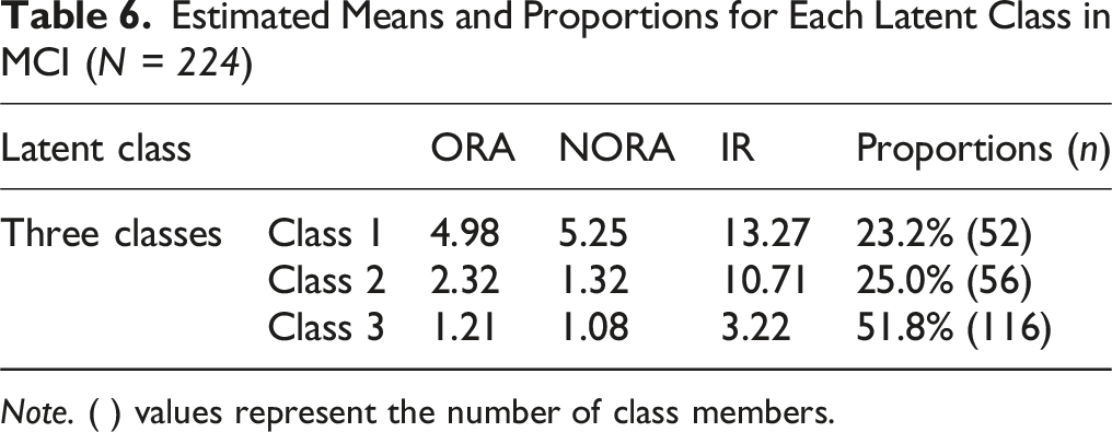 The LPA of R/S characteristics in patients with MCI identified three distinct latent classes (Table 6). Class 1 demonstrated mean scores of 4.98 for ORA, 5.25 for NORA, and 13.27 for IR. This group accounted for 23.2% (