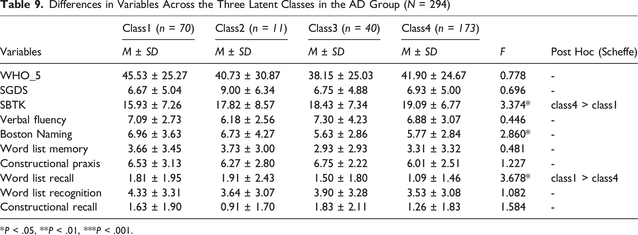 Differences in Variables Across the Three Latent Classes in the AD Group (