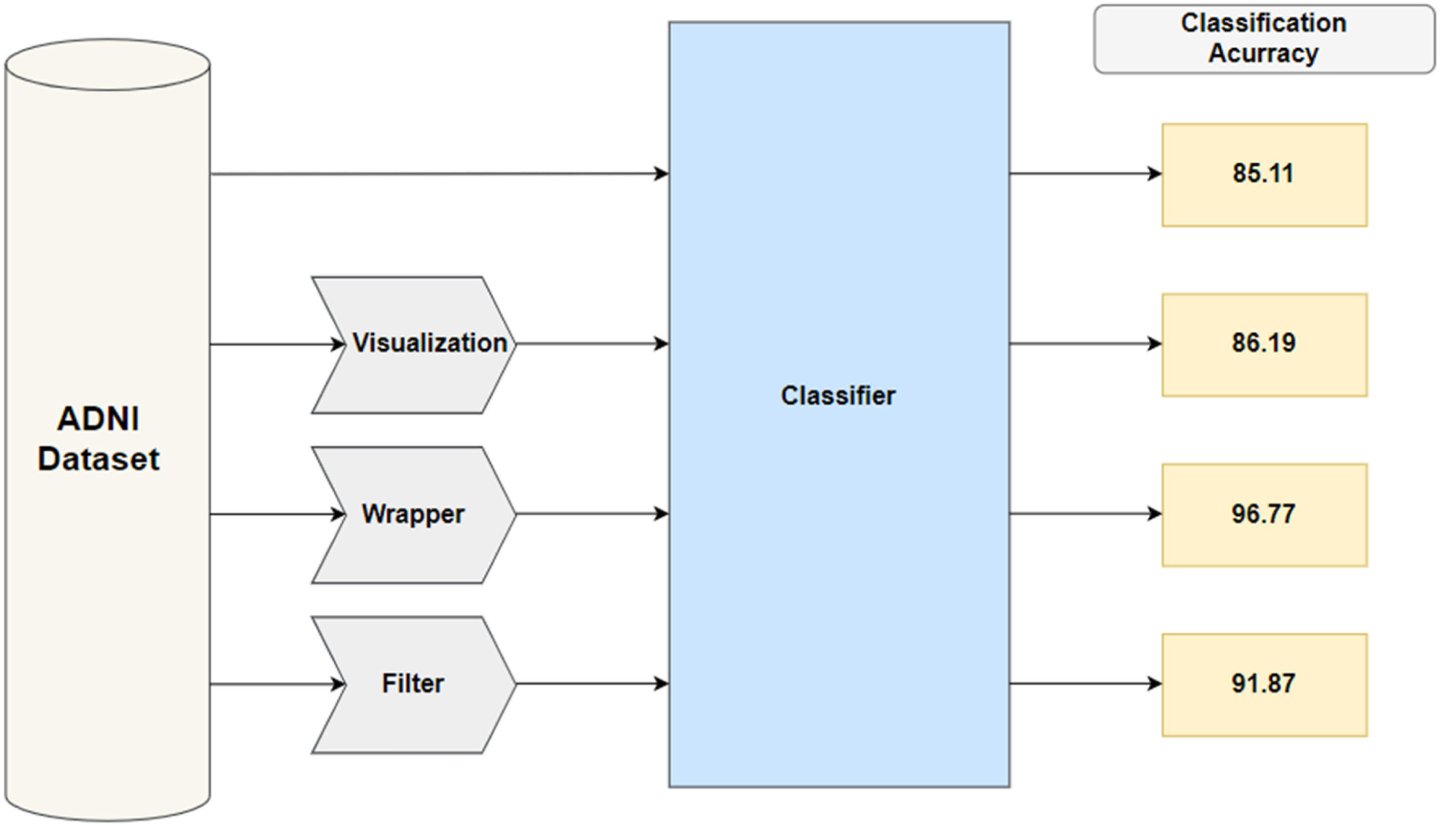 The obtained results using the previous different approaches were 85.1% for the entire dataset without applying any feature selection approach and this is due to that any classifier can hardly cope with large amounts of irrelevant features. Then three different feature selection approaches have been implemented on the ADNI dataset.