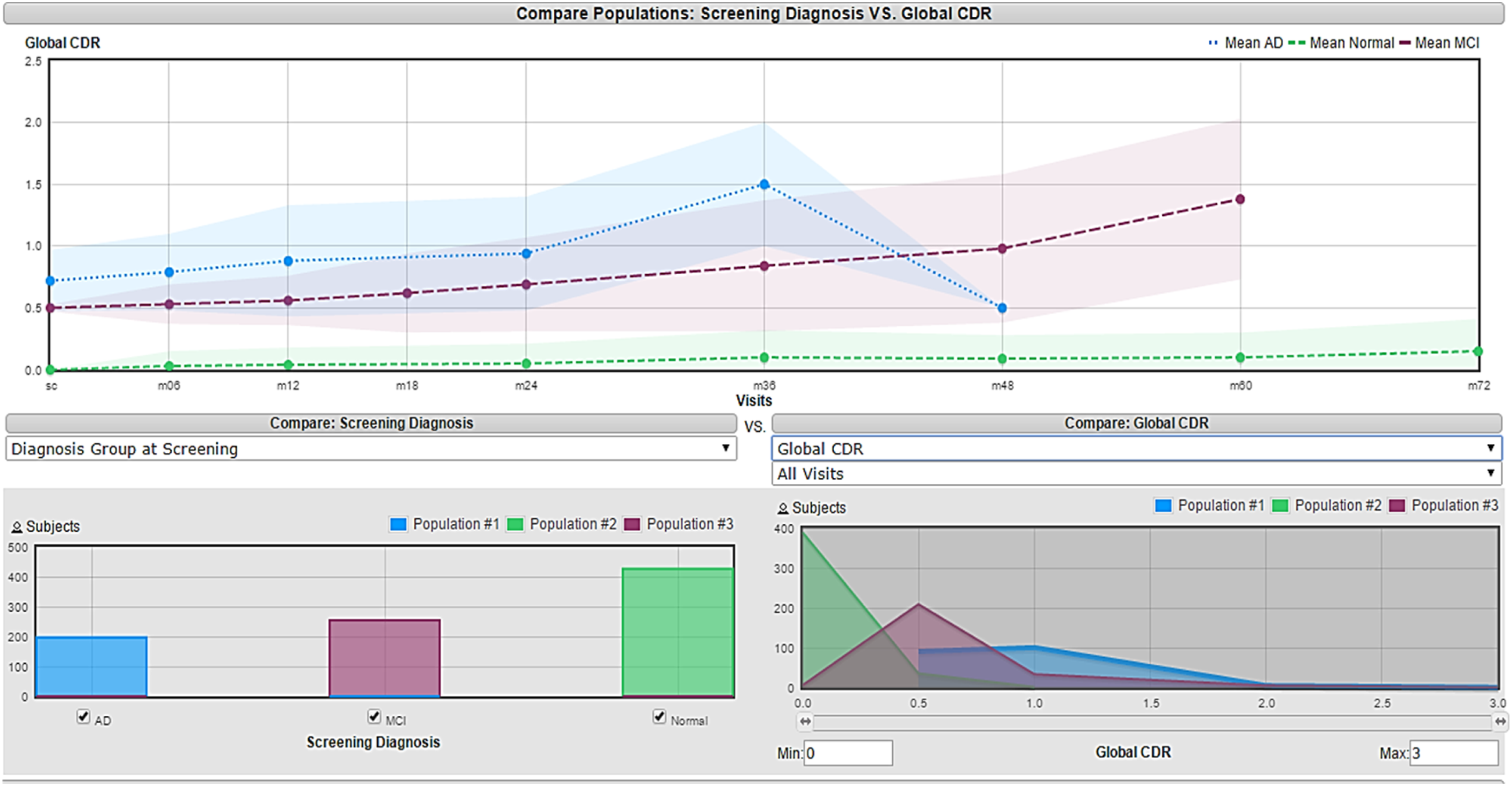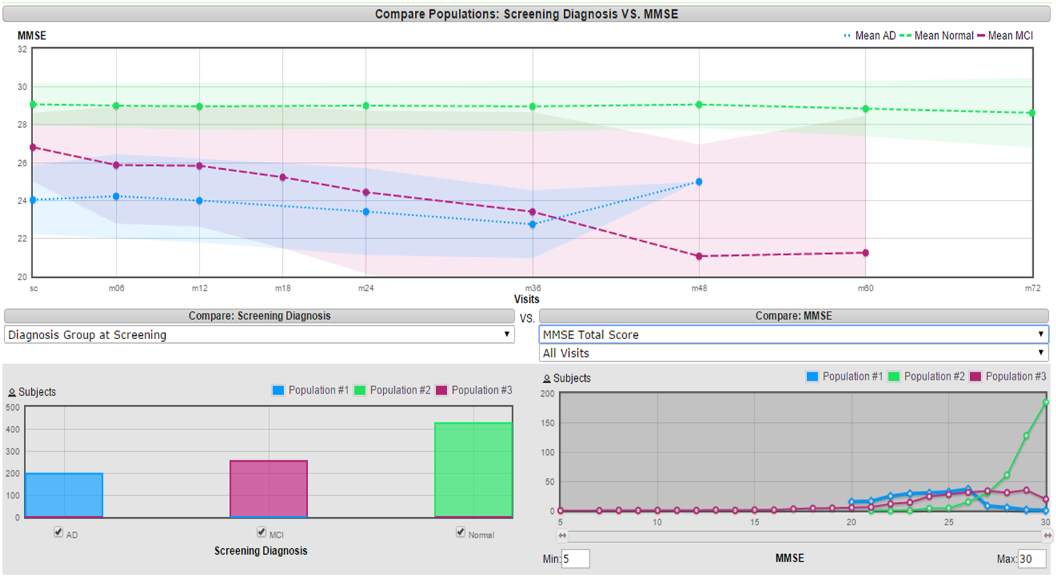 The insights gained from these visual analyses supported the interpretation of results produced by the quantitative feature-selection methods (filter ranking and wrapper-based subset evaluation). Visualization therefore served as a complementary interpretability tool, ensuring that the features identified by automated methods were consistent with known clinical and statistical characteristics of Alzheimer’s disease data. Figure 2 represents an example of a useful feature that can distinguish between the AD classes in a good manner since there is not too much overlapping. The features that were selected based on this approach are the Functional Assessment Questionnaire Total Score (baseline), Global CDR (6 months), MMSE Total Score (screening), and MMSE Total Score (6 months). Visualization of MMSE feature