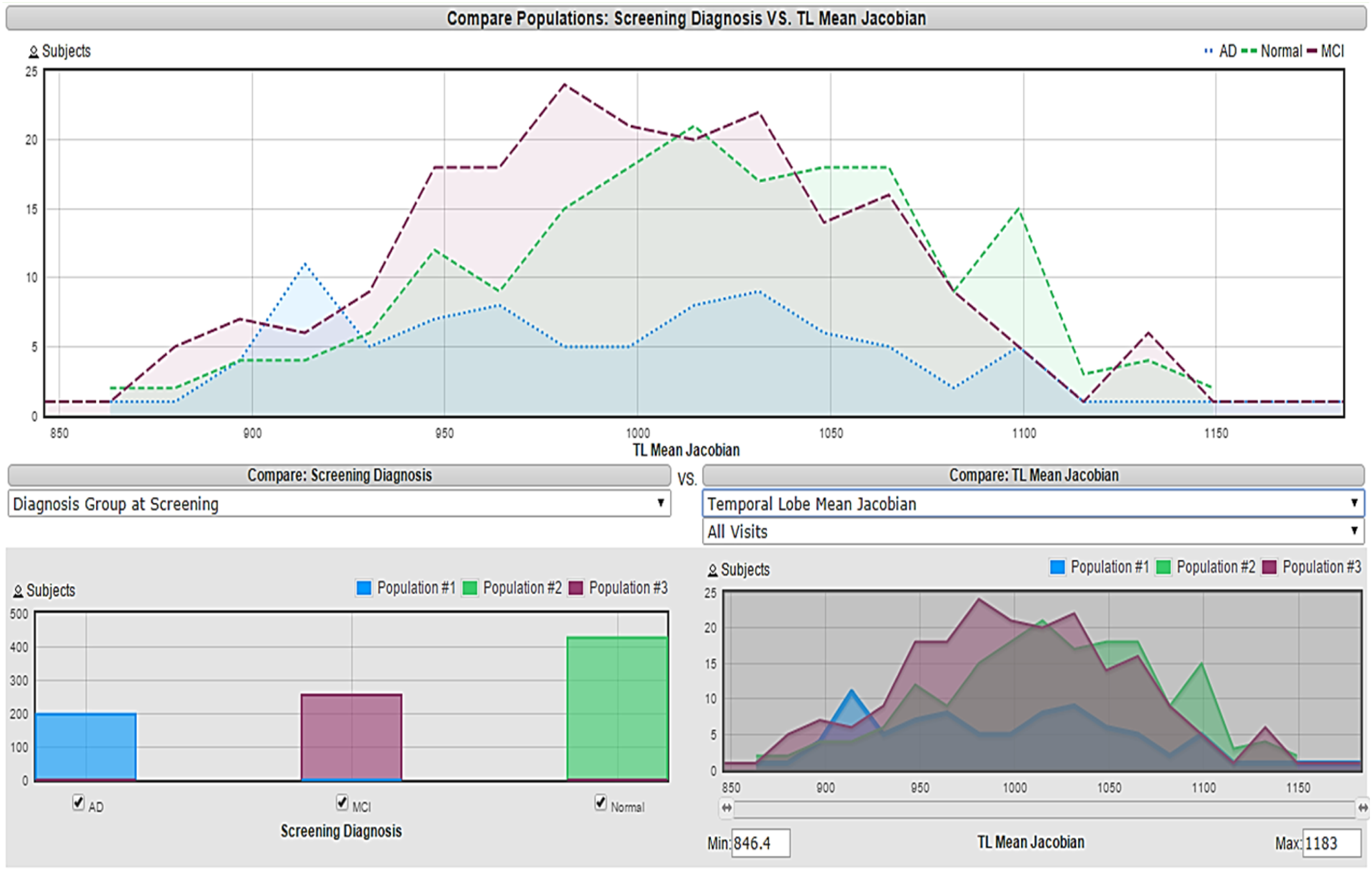 Visualization approach in which each feature’s histogram is presented vs the three target classes and the criterion for eliminating the feature depends on the amount of overlapping. This method slightly enhanced the accuracy obtained to 86.19%. An example of a selected feature using a visualization approach is shown in Figure 3, which is the global CDR since its histogram does not show a lot of overlap between the three classes. Figure 4 represents a Temporal Lobe Mean Jacobian, the histogram in the bottom right corner shows high overlapping between the three classes, making it difficult to be used for classification purposes. Visualization of global CDR feature