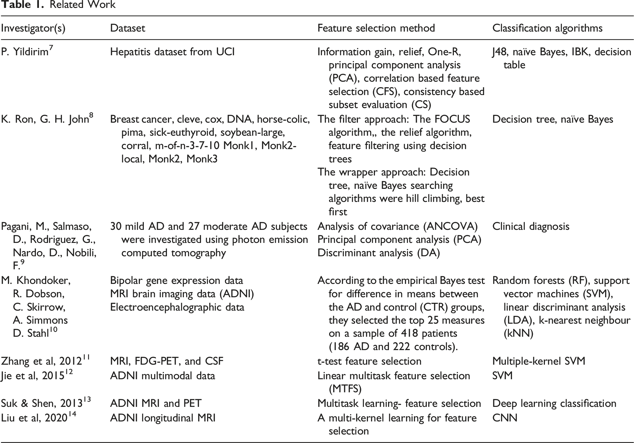 In the second stage, three different methods for feature selection were applied and their resulting feature subsets along with the original ADNI dataset were plugged into the selected classification algorithm. Then in the third stage, the naive Bayes (NB) classifier was applied to the resulting feature subsets from the previous stage. NB is characterized by its simplicity and good results obtained in most cases.