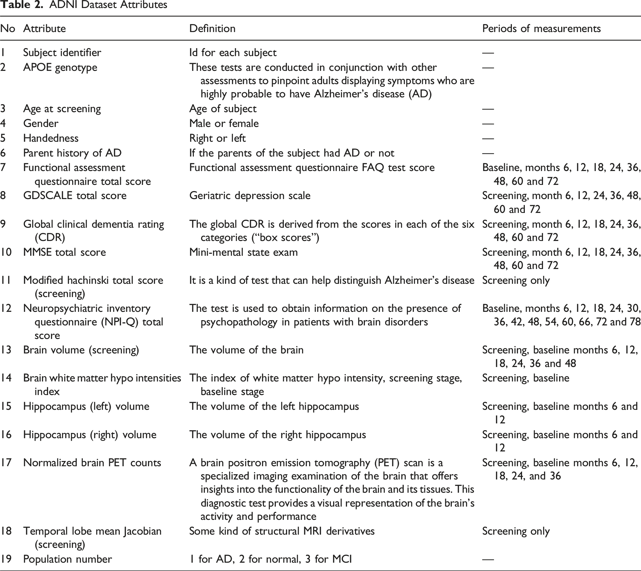 The obtained results show that only 7.5% of the available features were sufficient in building a reliable classifier for the ADNI dataset. This implies that only six out of the 80 features are considered useful – this result is verified by high classification accuracy. Another conclusion is that the wrapper technique for feature selection provided competitive performance as compared to the other approaches. Moreover, some features were common between different approaches which are: Global CDR, Functional Assessment Questionnaire, Total Score, and MMSE Total Score which reflect the importance of these features in the diagnosis of AD. Also, this project aims to inspire researchers in the AD community to investigate more deeply to discover the hidden relationship between these features and the early stages of AD.