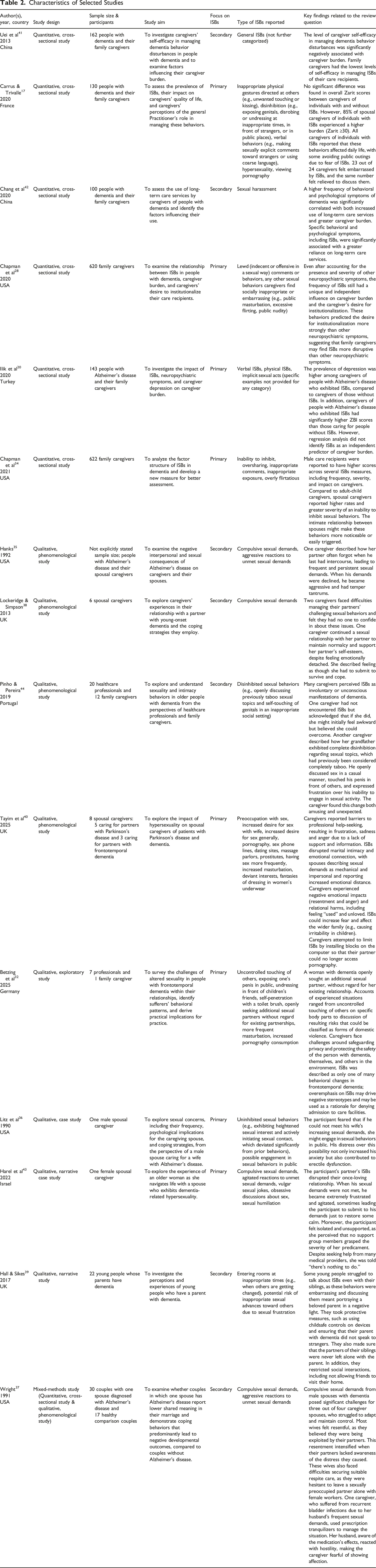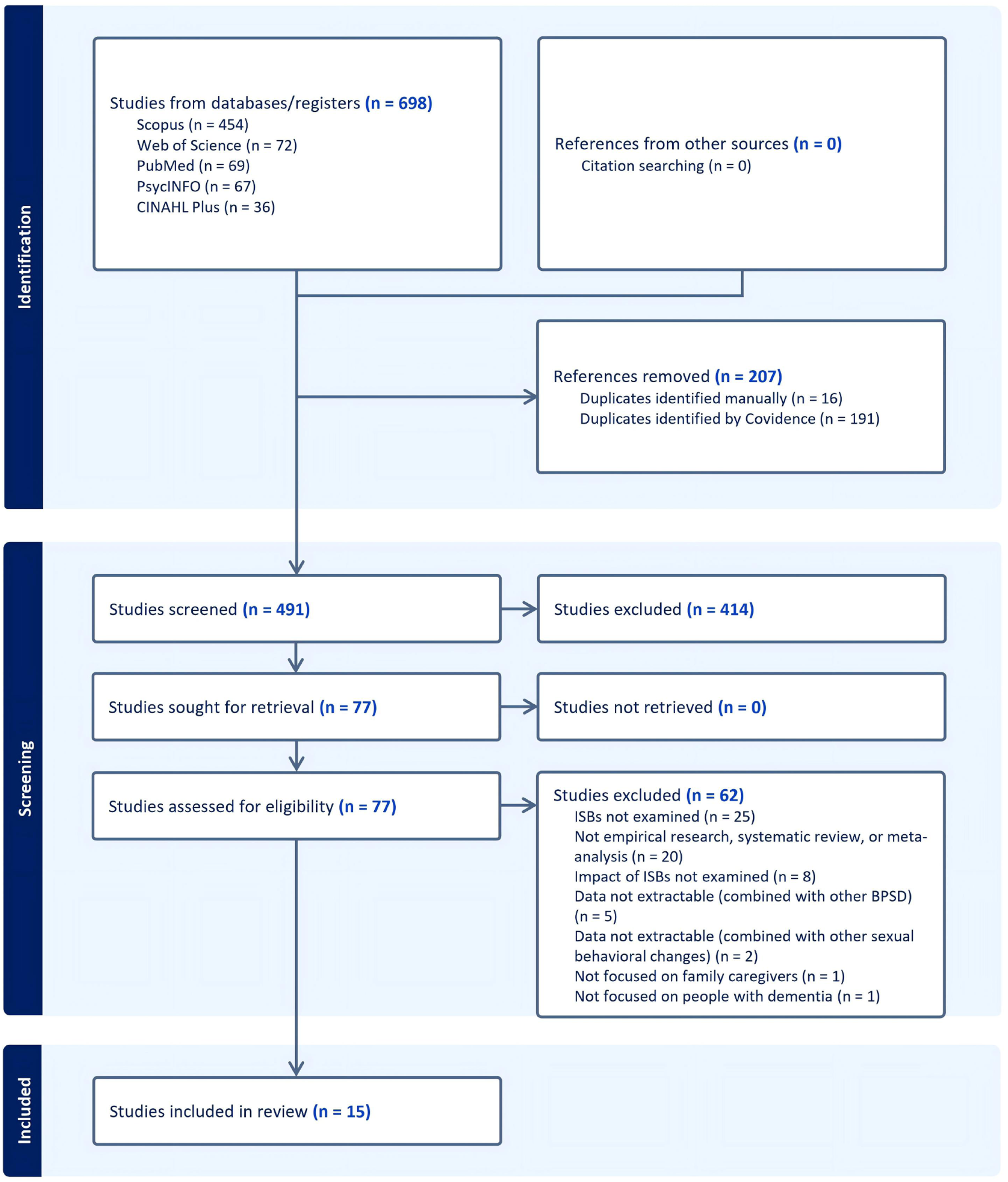 Studies involving any aspect of ISBs’ impact on family caregivers were included. Studies focusing solely on professional caregivers were excluded.