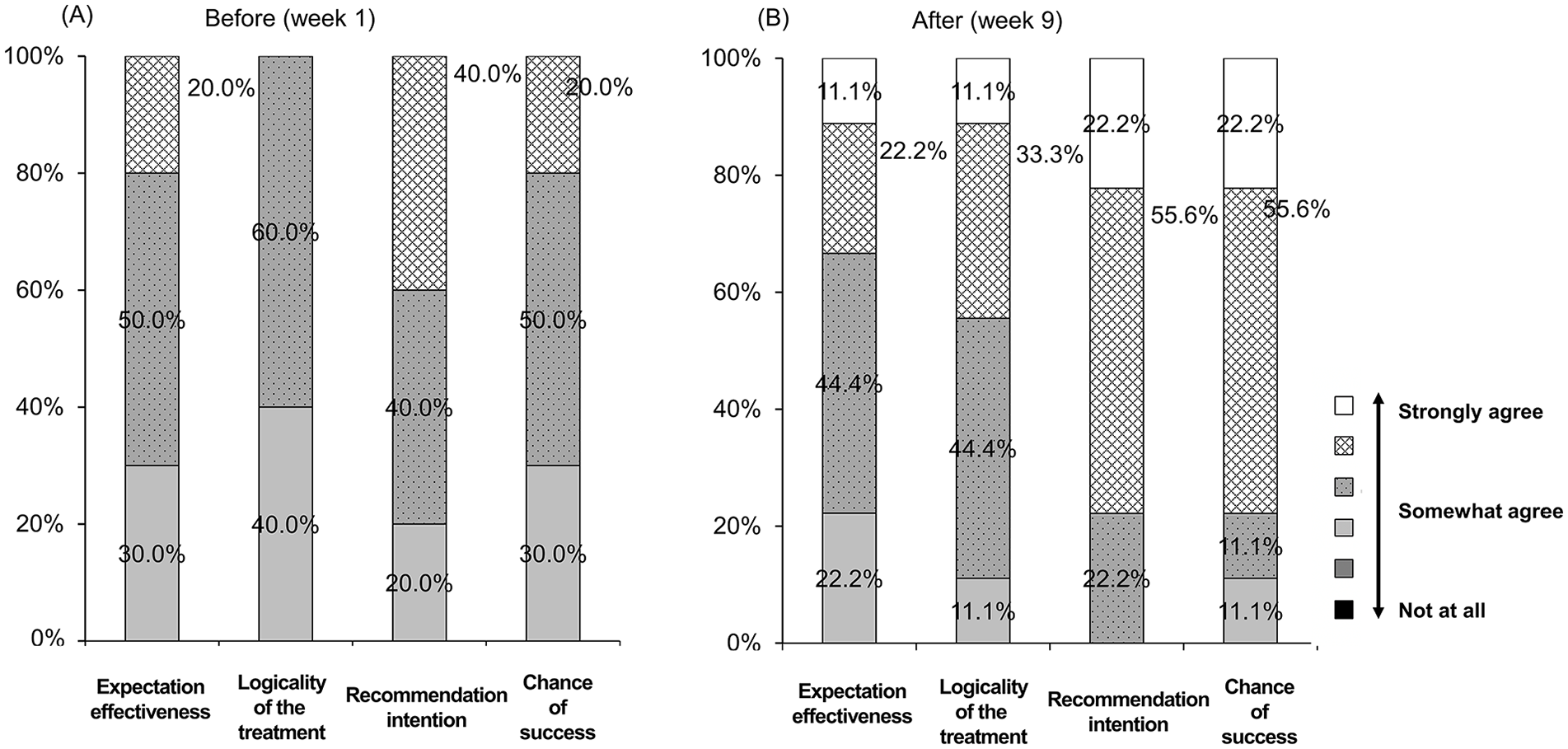 Changes in perception of the reliability of electronic moxibustion treatment using Credibility/Expectancy questionnaire. (A) Before. (B) After the study.