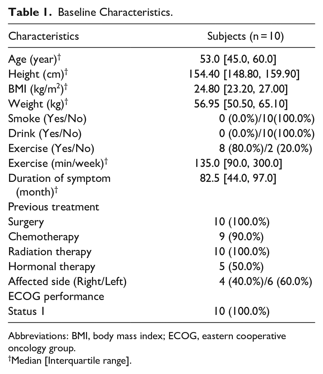 Eleven volunteers were screened for eligibility criteria, and 10 subjects were enrolled in this study (Figure 1). All 10 subjects were allocated to the treatment group, and all subjects completed the study without drop-out. Baseline characteristics of study participants are shown in Table 1. Median age at consent was 53.0 years, and all subjects were non-smokers and non-alcoholic drinkers. The majority of subjects (80%) exercised regularly. Median height and weight were 154.40 cm and 56.95 kg, respectively. The median duration of BCRL symptoms was 82.5 months. All 10 subjects underwent surgery and radiation therapy for cancer treatment.