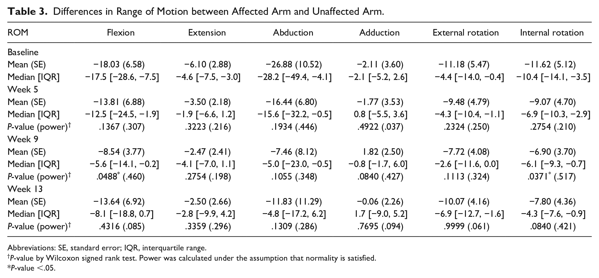 Differences in Range of Motion between Affected Arm and Unaffected Arm.