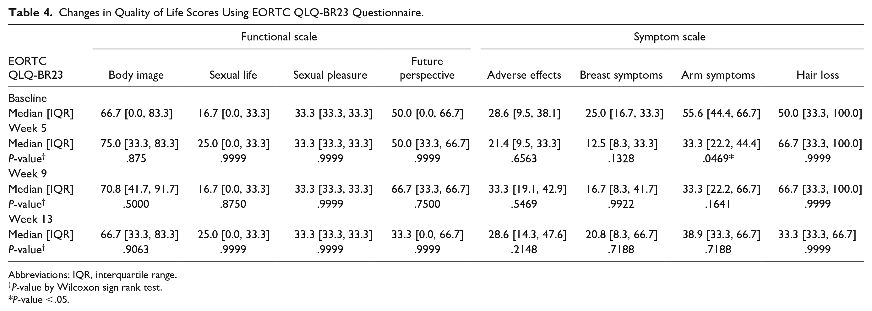 Overall quality of life of participants was not significantly different throughout the study (Table 4). Among categories of the EORTC QLQ-BR23 questionnaire, improvement of arm symptoms was significant only at week 5 (