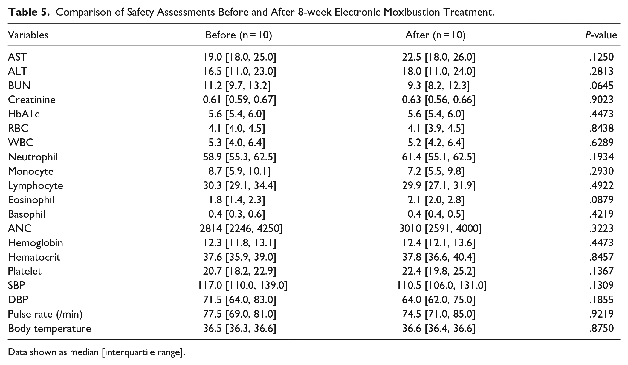 Comparison of Safety Assessments Before and After 8-week Electronic Moxibustion Treatment.