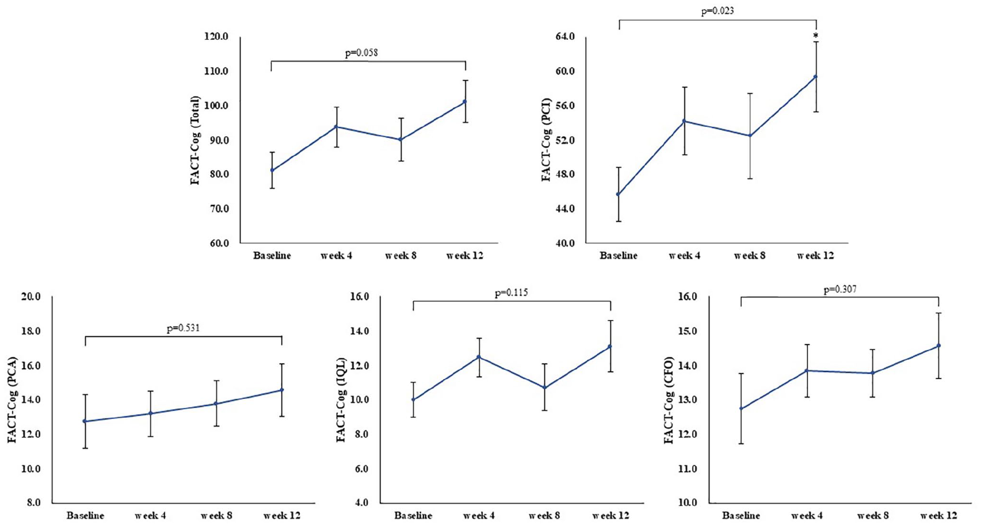 The total score and subscale of FACT-Cog at baseline (week 0), week 4, 8, and 12. All values are mean ± SE.