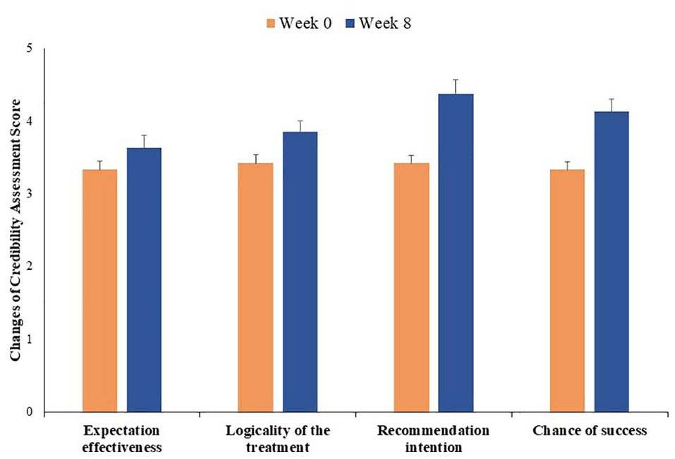 Credibility assessment at week 0 and 8. All values are mean ± SE.