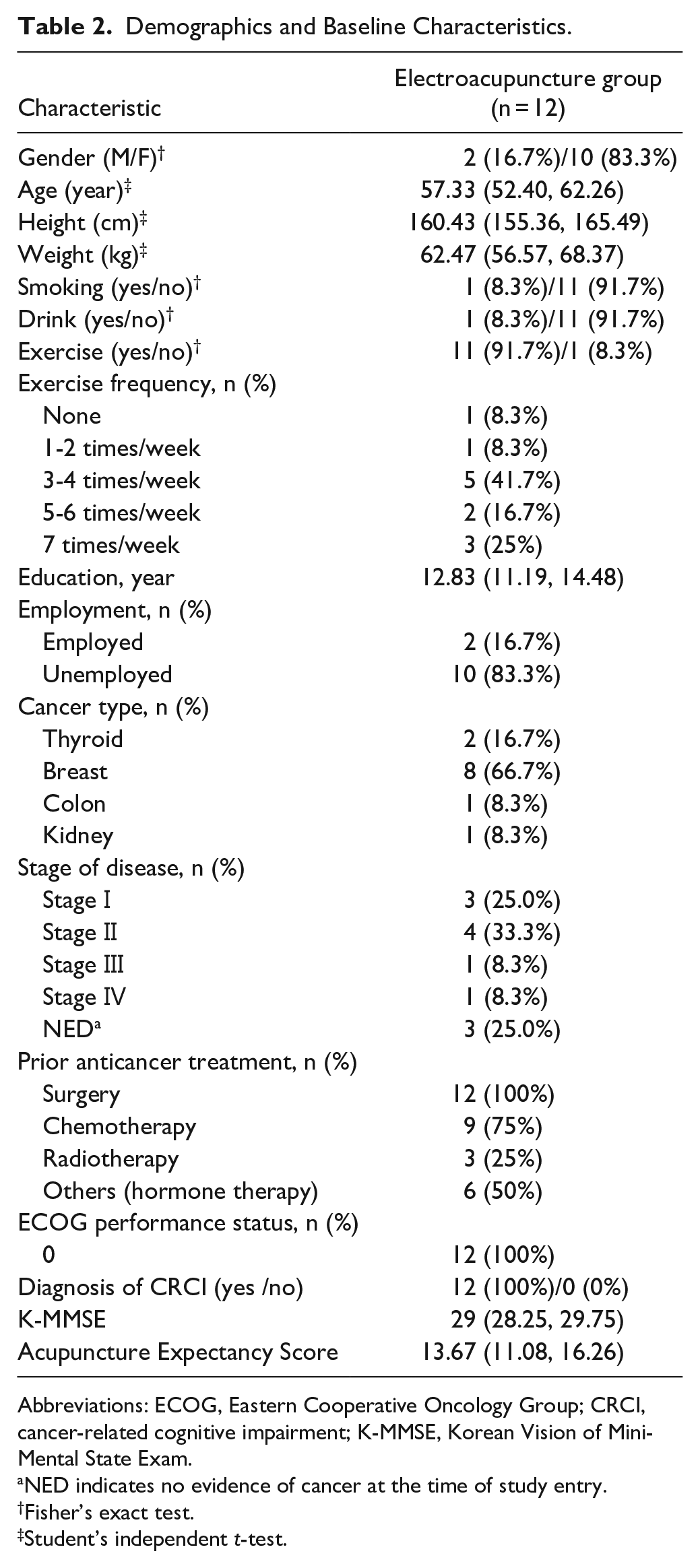Among the 12 participants, 8 were diagnosed with breast cancer, 2 with thyroid cancer, 1 with colon cancer, and 1 with kidney cancer, with varied stages in each participants from stage Ⅰ to Ⅳ. All 12 subjects had undergone surgery for cancer treatment, 9 had received chemotherapy, 3 received radiation therapy, and 6 received either hormonal therapy or targeted therapy. The ECOG performance status of all participants was recorded as 0, which means fully active and able to perform all pre-disease performance without restriction. 42 All 12 patients had been diagnosed with CRCI, and only one subject had previously been treated for CRCI. The K-MMSE score of all participants ranged from 27 to 30, with an average of 29. 43