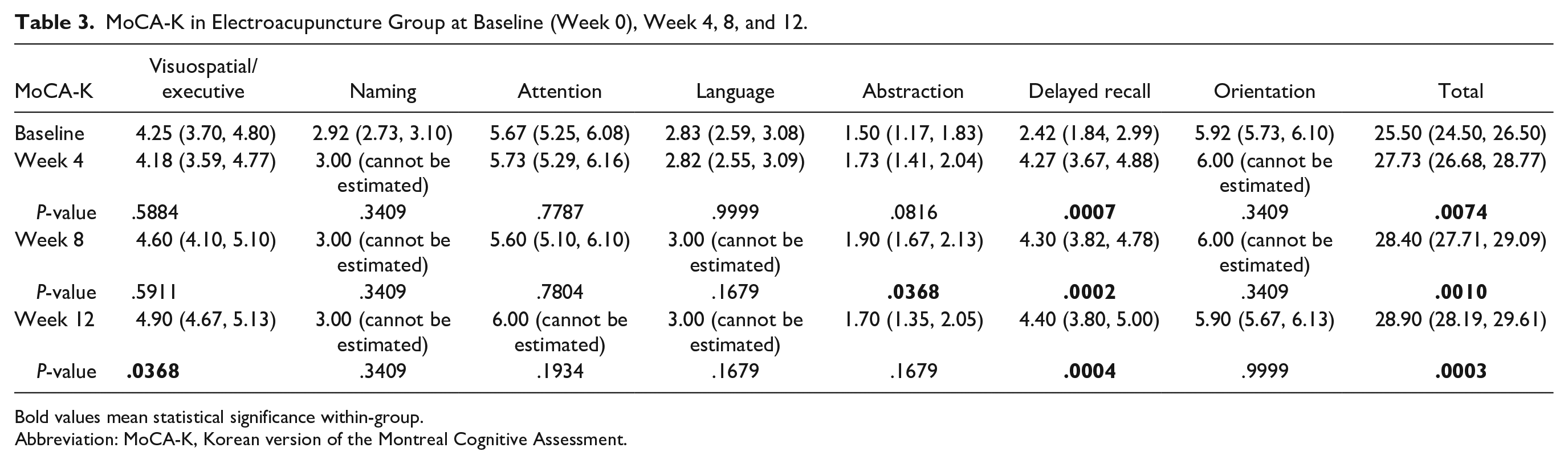 After electroacupuncture treatment, the total MoCA-K score significantly increased at weeks 4, 8, and 12 (