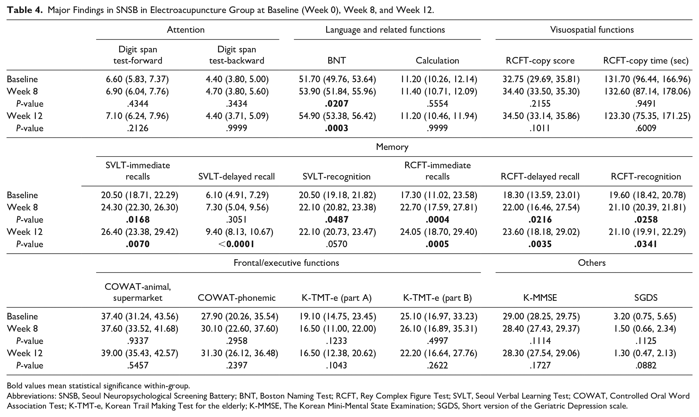 Among the objective neuropsychological tests measured in our study, MoCA-K, BNT, SVLT, and RCFT showed statistically significant improvement after electroacupuncture treatment. Significant differences in the total score of MoCA-K compared with the baseline could be observed immediately from week 4, and it gradually improved over time, scoring the highest point of 28.90 on week 12. Among the domains in the MoCA-K, electroacupuncture showed the greatest improvement in the delayed recall section, followed by the visuospatial/executive and abstraction domains, indicating that electroacupuncture has the greatest effectiveness in enhancing memory among diverse cognitive functions. SVLT and RCFT are neuropsychological tests for verbal and visuospatial memory, respectively, both of which consist of immediate recall test, delayed recall test after 20 minutes, and recognition test. Electroacupuncture had significantly improved in all 3 of these tests on both SVLT and RCFT, indicating its effectiveness in overall encoding, storage, and retrieval processes of memory performance. 58 However, in the RCFT-copy test which was performed to assess visuospatial function, the copy-score and time did not show significant differences after 8 and 12 weeks. Based on these results, we can also expect that electroacupuncture may be more effective in memory progression than visuospatial function. Lastly, the BNT test for language and related functions showed significant increases after 8 and 12 weeks. Similar results could also be found in the language domain on MoCA-K, as the score of the language domain increased from 2.83 at baseline to 3.0 at week 8 and 12, although the difference was not statistically significant. These results support the evidence that electroacupuncture may be helpful for language-related cognitive functions. Taken together with our neuropsychological test results, we can conclude that electroacupuncture is effective primarily in improving the memory domain and language-related functions.