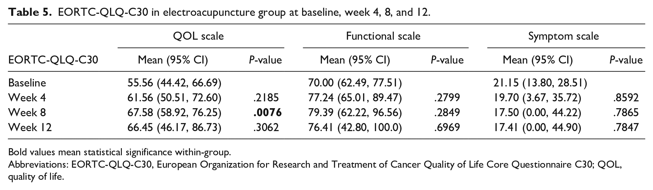 EORTC-QLQ-C30 in electroacupuncture group at baseline, week 4, 8, and 12.