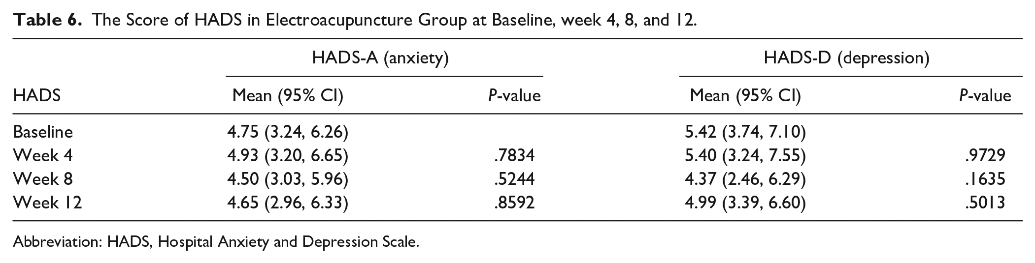 The Score of HADS in Electroacupuncture Group at Baseline, week 4, 8, and 12.
