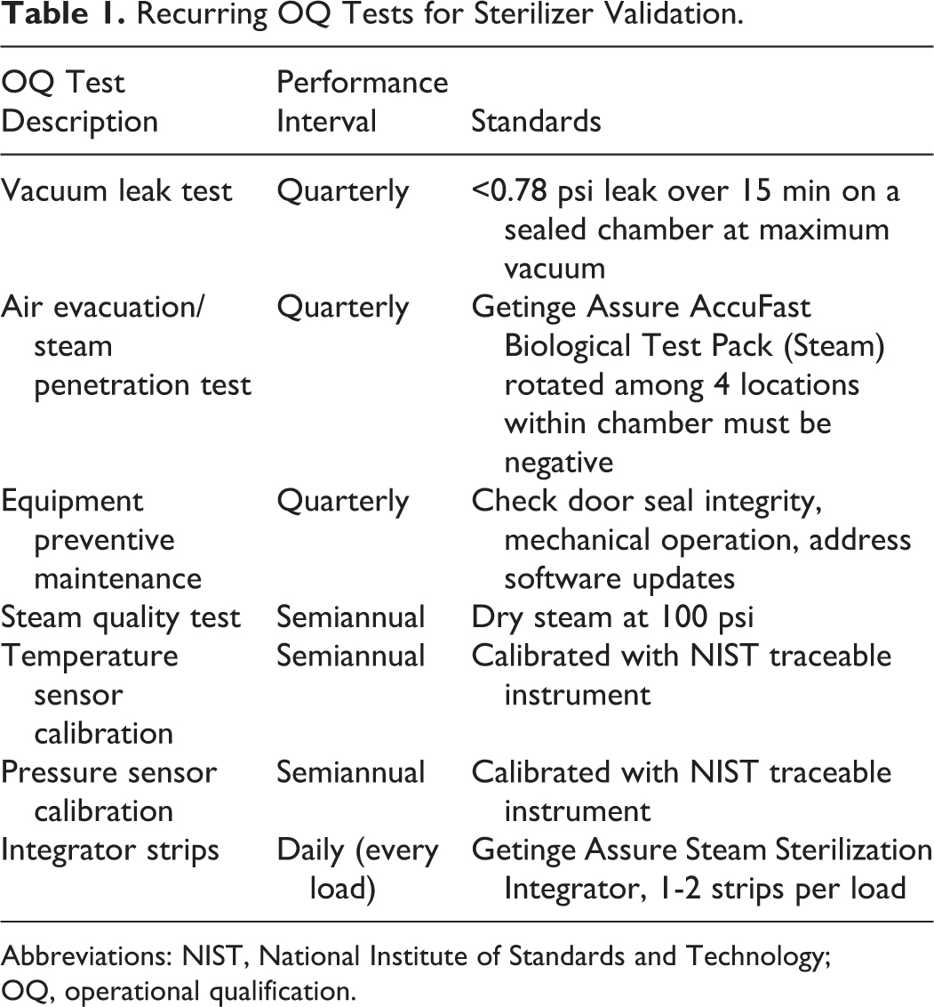 OQ includes verification that the installed equipment is operating properly within predetermined limits when used by trained personnel in accordance with standard operating procedures. 8 Unlike, IQ, OQ is not a onetime event but rather should be accomplished on a recurring basis to ensure continued verifiable operation of the autoclave over time by institute staff. The formal tests to perform should include, at a minimum, a vacuum leak test, air evacuation/steam penetration test (Bowie-Dick or equivalent test), steam quality testing, temperature and pressure sensor calibration, equipment preventive maintenance, and integrator strip testing. 8 An example of an OQ program used by our institute is described in Table 1.