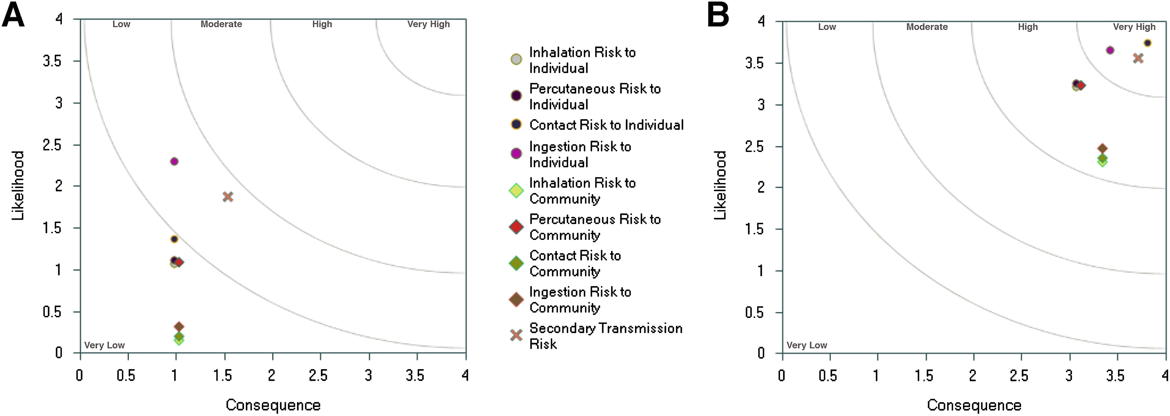 Graphical output from the Biosafety Research Animal Management System (RAMS) showing the degree of risk to humans in the laboratory and community for (A) a Risk Group 2