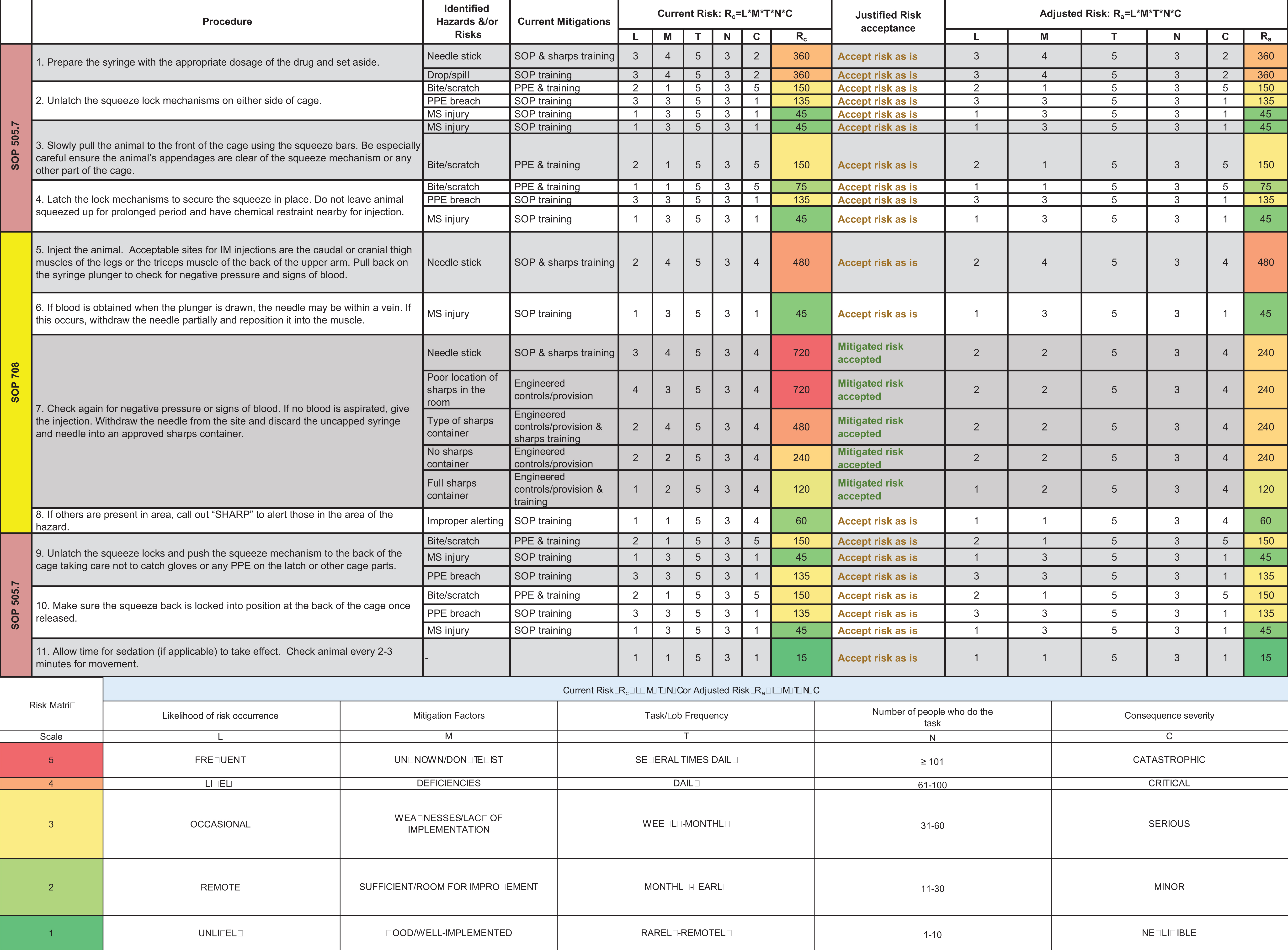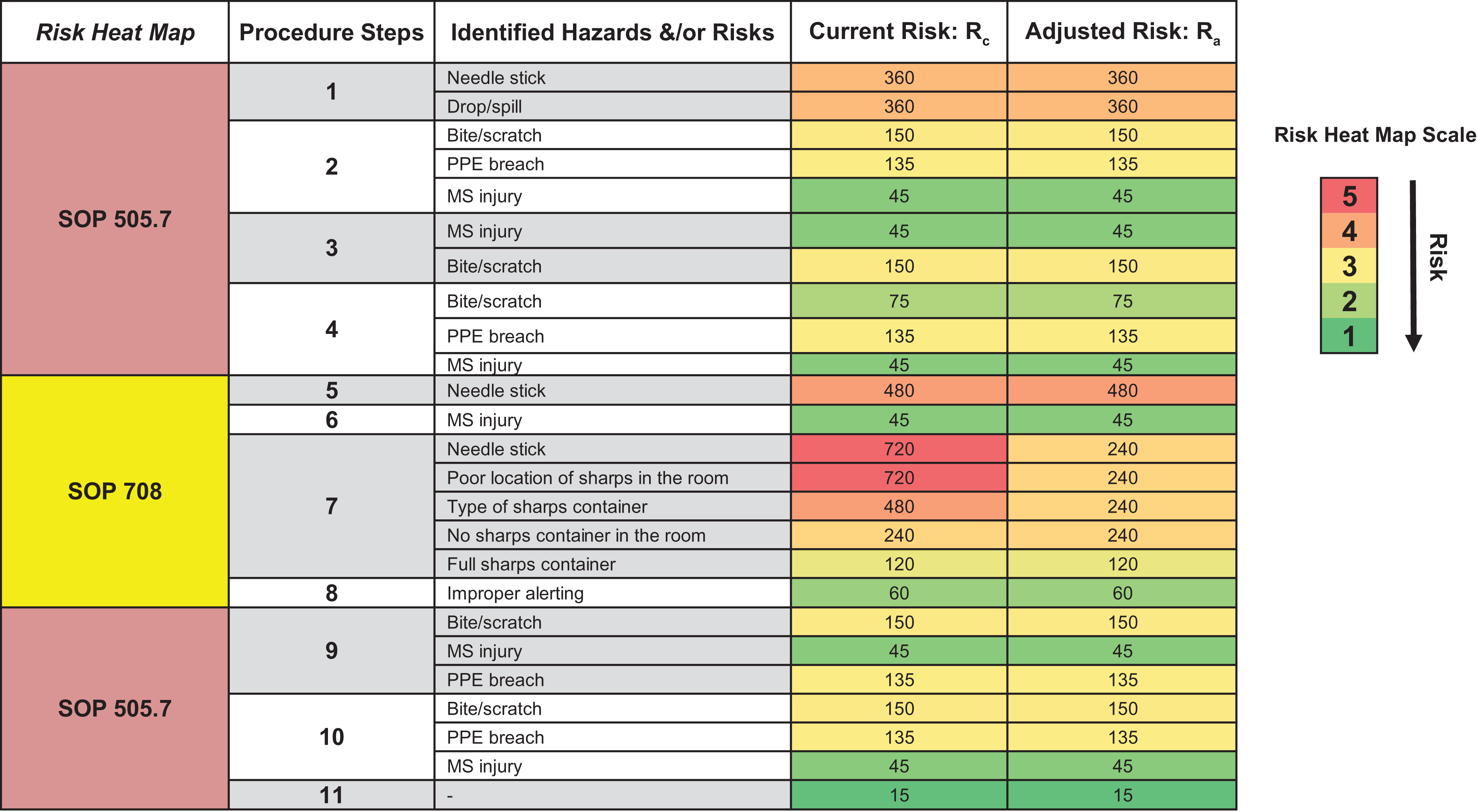To determine the feasibility of recommended mitigations, it is necessary to “test drive” these mitigations. This involves working with frontline staff to receive their input and feedback to refine work processes. As part of this phase of the occupational risk management process, the adjusted risk (Ra) landscape is determined using the aforementioned matrix to generate a corresponding heat map. Ra should be lower than Rc. Given animal facilities have a dual obligation to keep personnel safe and ensure the well-being of housed animals, it is essential that recommended mitigations maintain occupational safety and animal welfare.