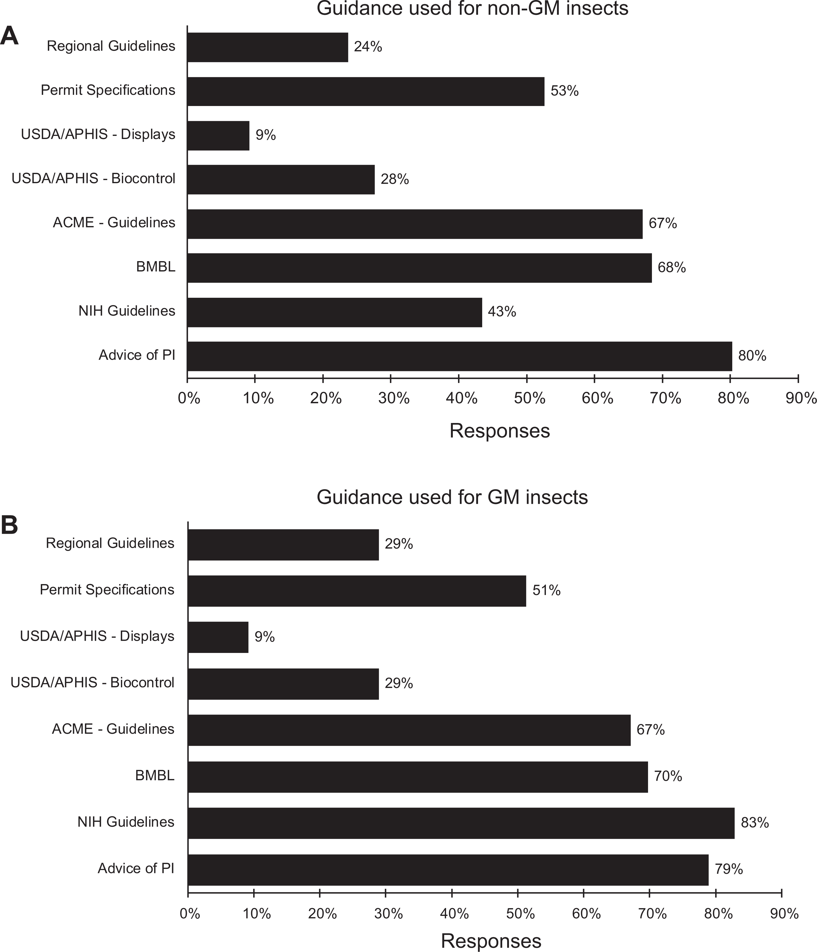 Guidance documents used in assessing risks and containment requirements for (A) nongenetically modified insects and (B) genetically modified insects. n = 76. ACME–Guidelines, arthropod containment guidelines