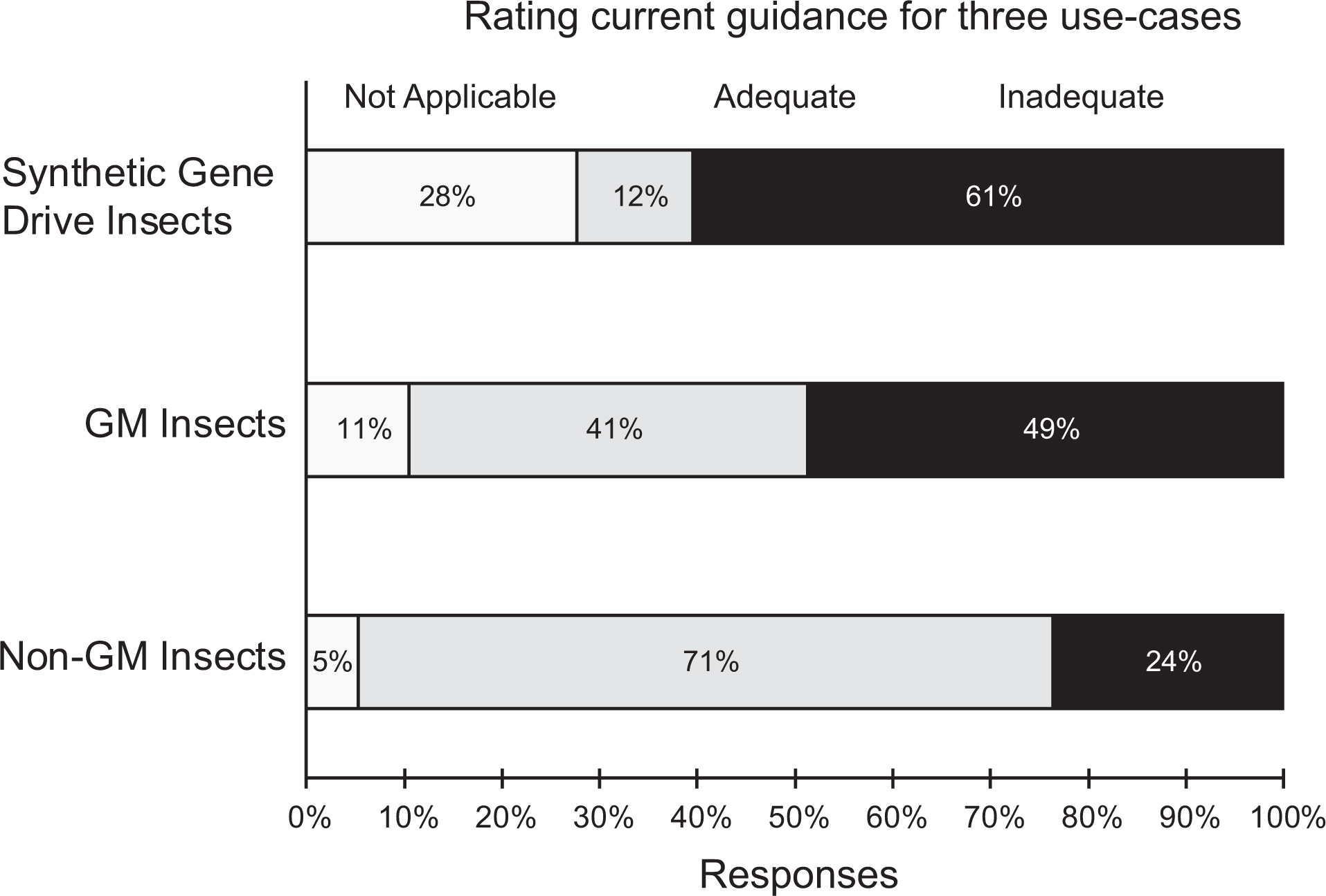 When asked whether the guidance documents they rely on for insect risk assessment and containment decisions were adequate or inadequate, respondents’ responses varied depending on the transgenic genetic status of the insects. Three quarters (75%) of respondents thought existing guidance for nongenetically modified insects was adequate (Figure 3). When considering genetically modified insects, only 46% thought existing guidance was adequate (Figure 3), whereas only 16% of the respondents thought existing guidance was adequate when considering risk and containment of genetically modified insects containing gene drives (Figure 3).