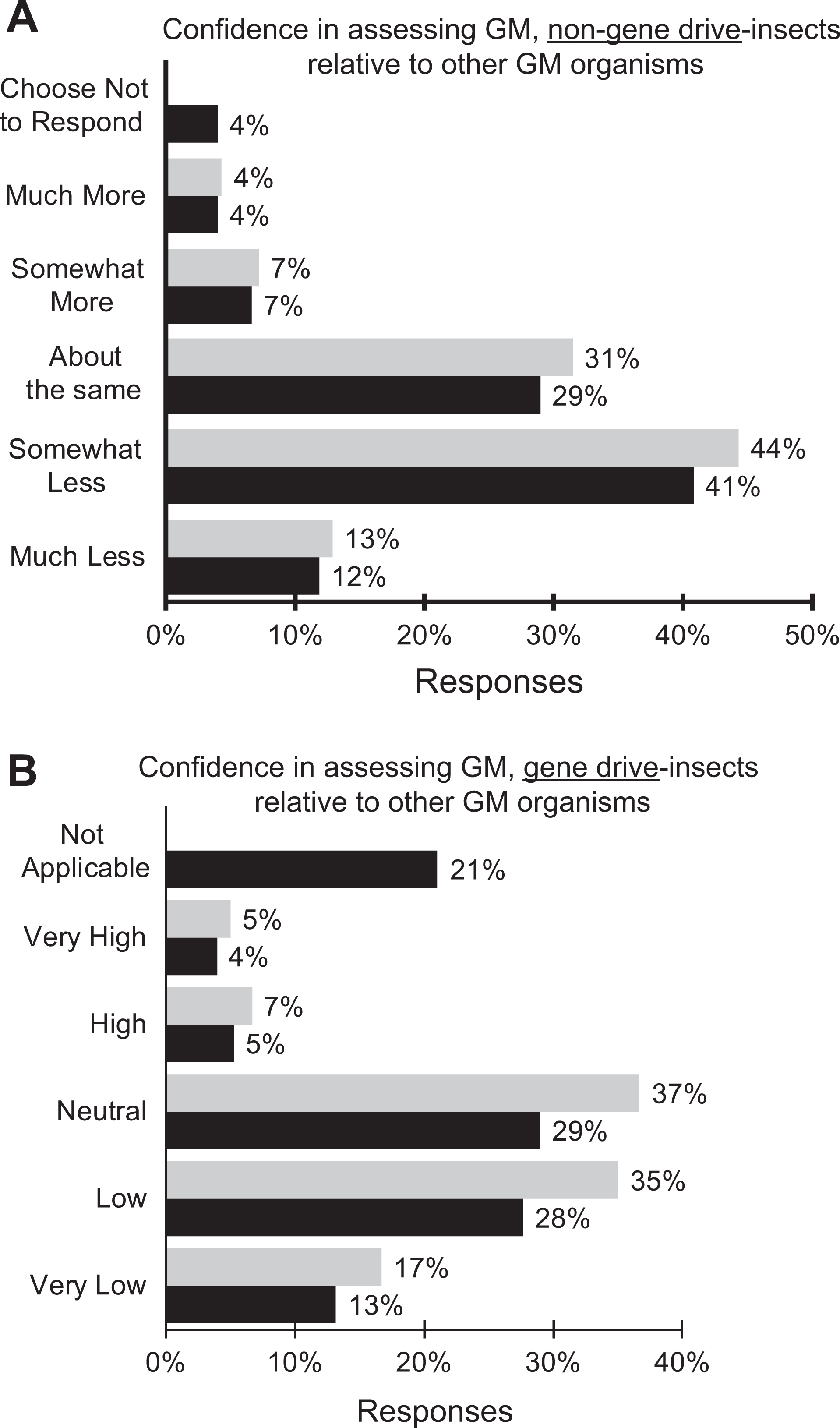 Confidence of respondents in assessing the risks and containment requirements associated with (A) genetically modified insects without gene drive compared to other genetically modified organisms (eg, microbes, animals, plants); black = all responses (n = 76) and grey = only applicable responses (n = 73); (B) genetically modified insects with synthetic gene drive compared to other genetically modified organisms (eg, microbes, animals, plants); black = all responses (n = 76) and grey = only applicable responses (n = 60). Respondents had the option of responding “not applicable” to accommodate the possibility that they did not have experience with genetically modified insects with or without gene drive.
