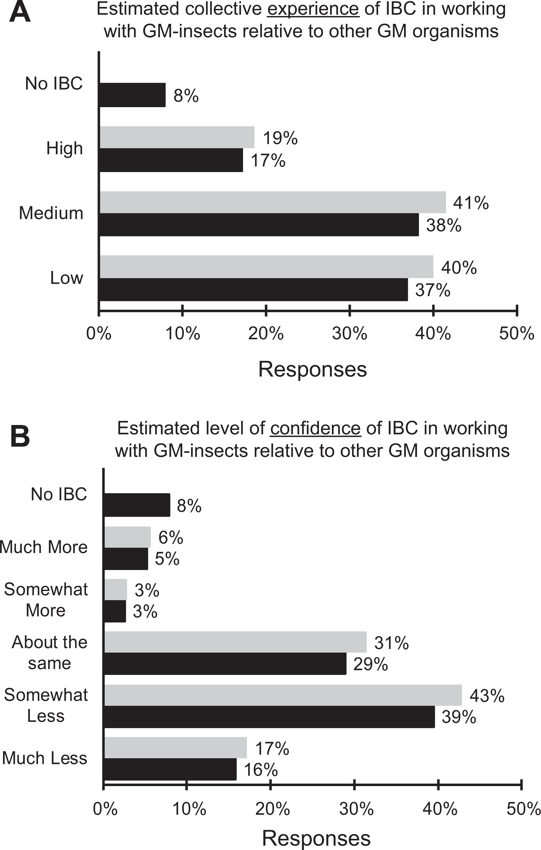 Respondents’ estimation of the level of their institutional biosafety committees’ (A) collective experience in assessing risks and containment requirements for laboratories working with genetically modified insects compared to other genetically modified organisms (eg, microbes, animals, plants); black = all responses (n = 76) and grey = only those with institutional biosafety committees (n = 70); (B) level of confidence in assessing risks and containment requirements for laboratories working with genetically modified insects compared to other genetically modified organisms (eg, microbes, animals, plants), black = all responses (n = 76) and grey = only those with institutional biosafety committees (n = 70).