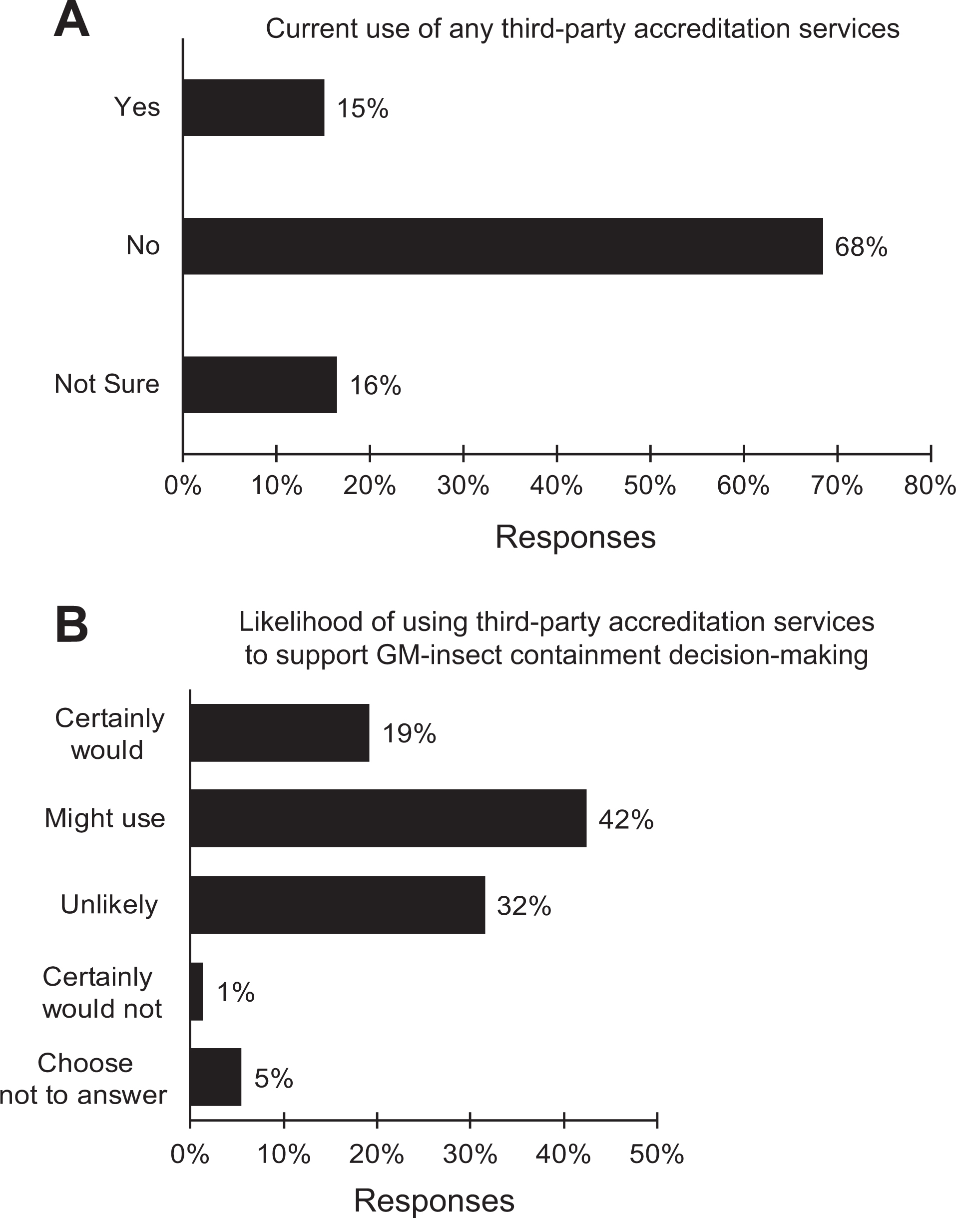 In this study, survey participants were asked about their experience with third-party accreditation services and the likelihood of their using such a service that could support their compliance efforts associated with genetically modified insects. Approximately 60% of the survey’s respondents said they either certainly would or might avail themselves of a voluntary third-party accreditation service for insect containment facilities and management practices. As with other third-party accreditation services, this could serve to raise and harmonize transgenic insect containment standards.