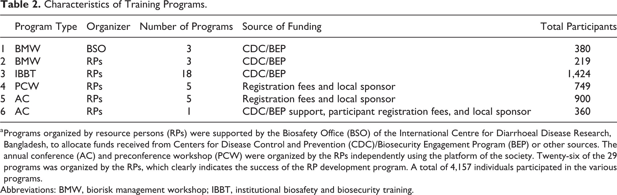 a Programs organized by resource persons (RPs) were supported by the Biosafety Office (BSO) of the International Centre for Diarrhoeal Disease Research, Bangladesh, to allocate funds received from Centers for Disease Control and Prevention (CDC)/Biosecurity Engagement Program (BEP) or other sources. The annual conference (AC) and preconference workshop (PCW) were organized by the RPs independently using the platform of the society. Twenty-six of the 29 programs was organized by the RPs, which clearly indicates the success of the RP development program. A total of 4,157 individuals participated in the various programs.