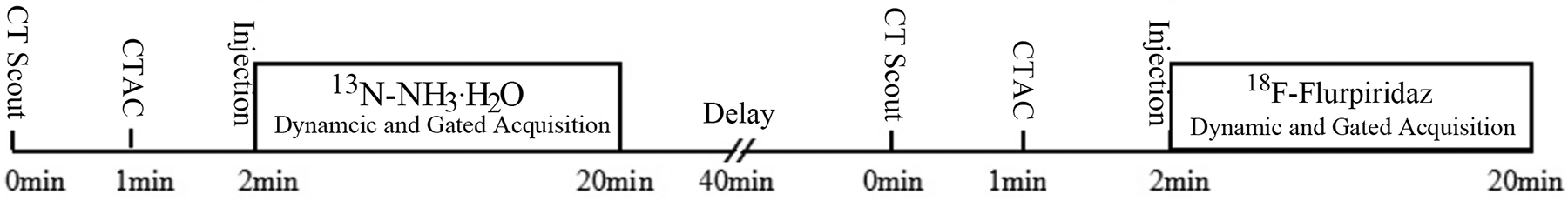Normal group: minipigs were fixed on the examination bed after sucessful anesthesia. 13N-NH3·H2O rest imaging was performed at first, 40 minutes later followed by 18F-Flurpiridaz rest imaging. The dynamic acquisition program was initiated immediately after rapid injection of 185∼370 MBq (3∼5 mCi) 13N-NH3·H2O through the ear vein, and flushed by 10 ml saline. The imaging acquisition parameters were as follows: the scanning voltage and current of CT was 120kVand 20 mA, and the dynamic data of PET in 3D dynamic list model form: 1 frame/10 s acquisition plus 12 frames, 1 frame/30 s acquisition plus 2 frames, 1 frame/60 s acquisition plus 1 frame, 1 frame/6 min acquisition plus 1 frame; After dynamic acquisition, 1 bed 3D rest gated myocardial perfusion was performed, including 8min/ bed, 8 frames/cardiac cycle, heart rate window was ±15%. After 40 min of 13N-NH3·H2O imaging, 185∼370 MBq (1∼2 mCi) 18F-Flurpiridaz was injected intravenously and started dynamic acquisition, whose parameters were the same as above. The flow chart of imaging process was shown in Figure 1.