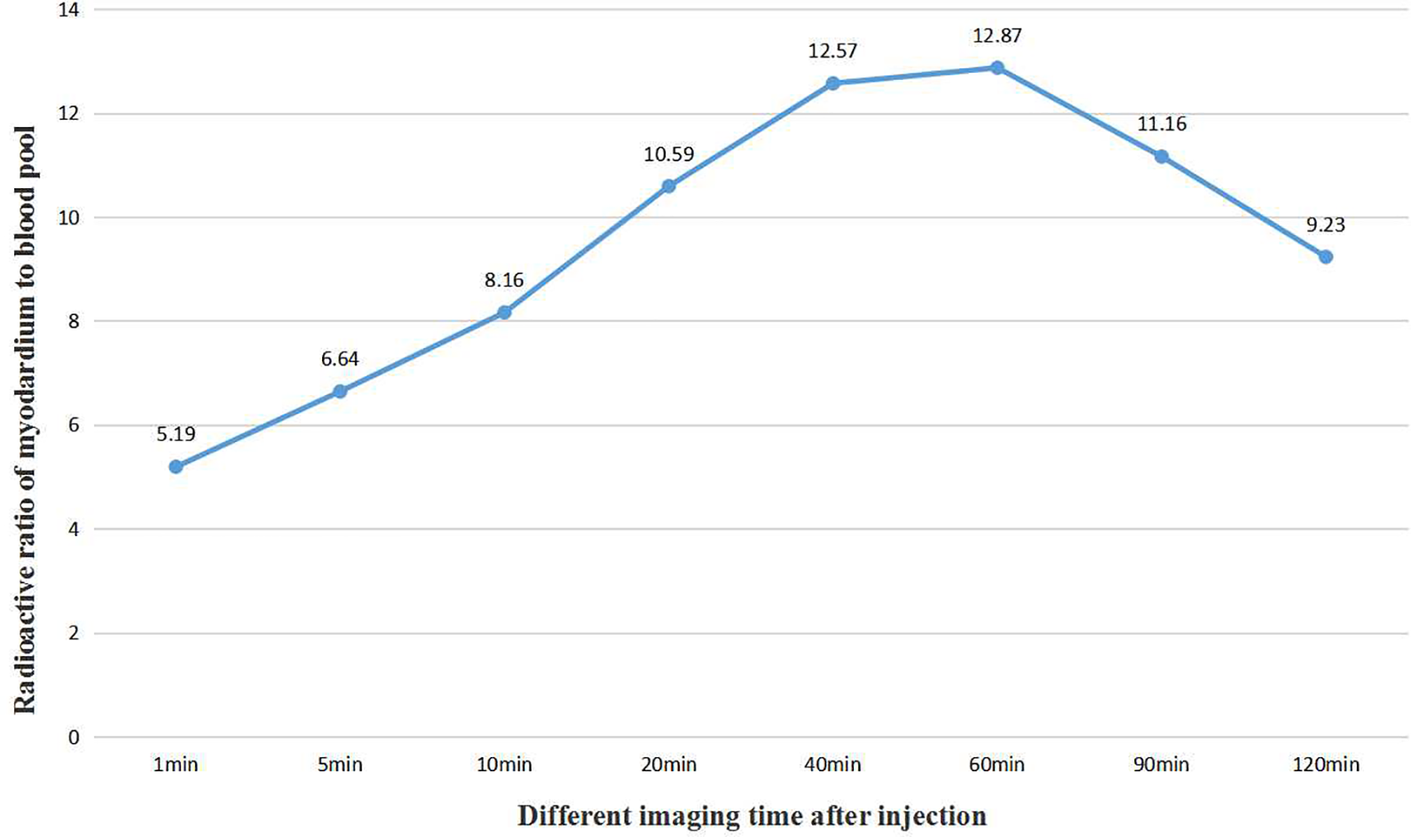 By calculating the radioactive ratio of left ventricular myocardium to blood pool, liver, lung, spleen and kidney at different time points after imaging agent injection, we found that the radioactive count ratios of left ventricular myocardium to blood pool increased gradually from 5.19 to 12.87 in 60 min, and began to decrease to 9.23 60 minutes later. The radioactive count in myocardium after injection of imaging agent 1 min was 5.19 times that of cardiac blood pool. Myocardial development was not affected by blood pool at all.The radioactive ratio of left ventricular myocardium to liver decreased gradually from 3.44 to 2.08 in 10 min, and increased gradually from 2.08 to 6.92 10 minutes later, indicating that the imaging agent had a slight uptake in the liver, gradually increased in a short period of time and was rapidly excreted, and the myocardial imaging was not affected by the liver count.
